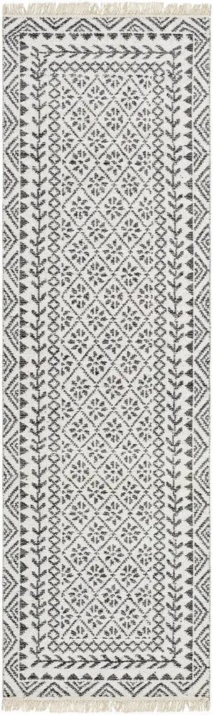 Collection: Hulda Colors: Light Brown, Dark Purple, Medium Gray, Gray, Dark Brown Construction: Hand Woven Material: 100% Wool Pile: No Pile Styles: Transitional,Bohemian Made In: India Thickness: 0.4" Fringe Length: 2" Price Range: $$$$$ (Affordable)