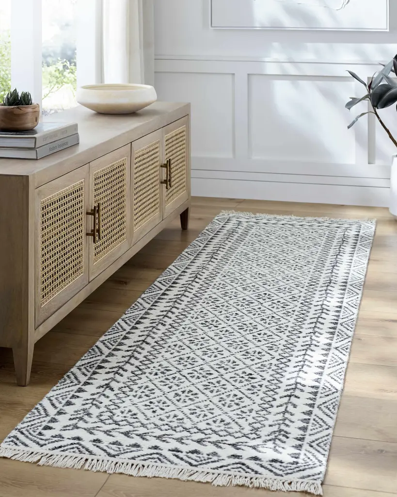 Collection: Hulda Colors: Light Brown, Dark Purple, Medium Gray, Gray, Dark Brown Construction: Hand Woven Material: 100% Wool Pile: No Pile Styles: Transitional,Bohemian Made In: India Thickness: 0.4" Fringe Length: 2" Price Range: $$$$$ (Affordable)