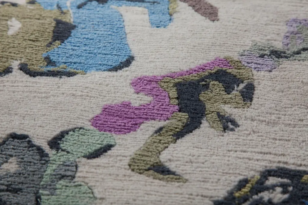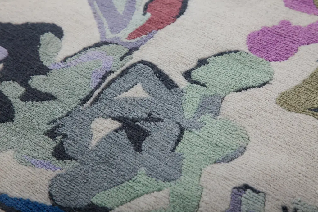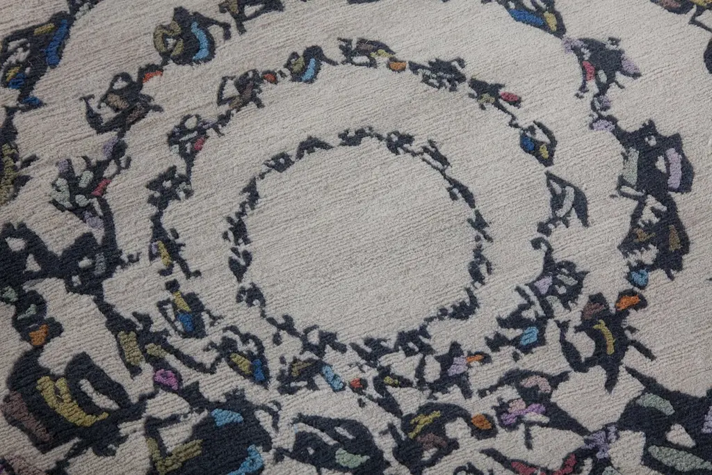 Gianni Veneziano and Luciana Di Virgilio have also explored the deeply symbolic valence of the sphere, however using it as the space for a humanistic reflection on the infinite confrontation between man and woman. Human Circle, Paradiso (for Allover) illustrates this notion by creating a circular decoration that highlights, at its core, the quintessential couple, in calm conversation. Whereas the more complex Human Circle, Inferno (for High Design Rugs) depicts the rings of a beckoning spiral, which allude to Dante's Inferno.