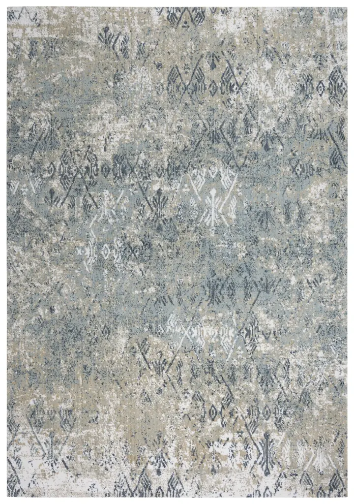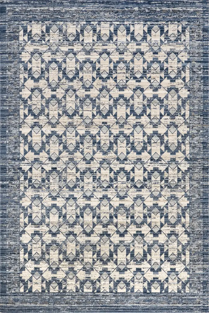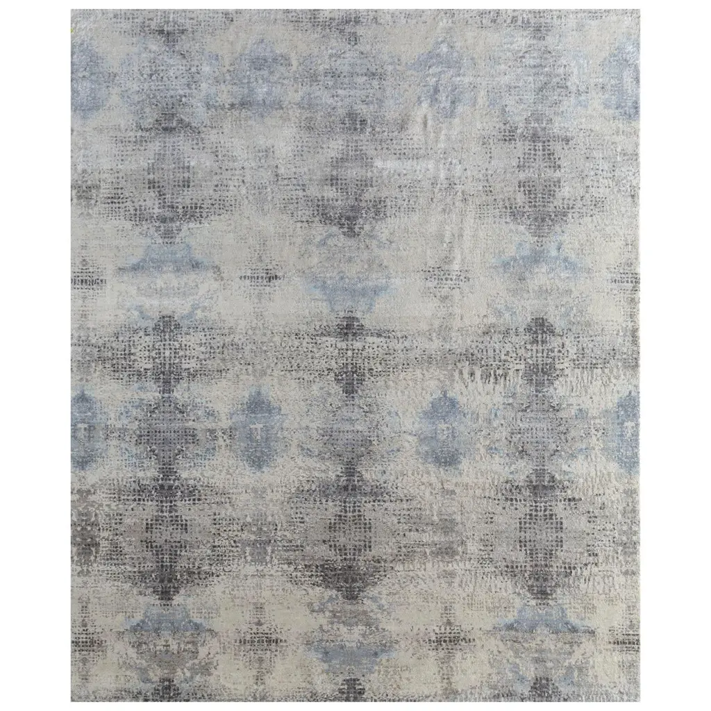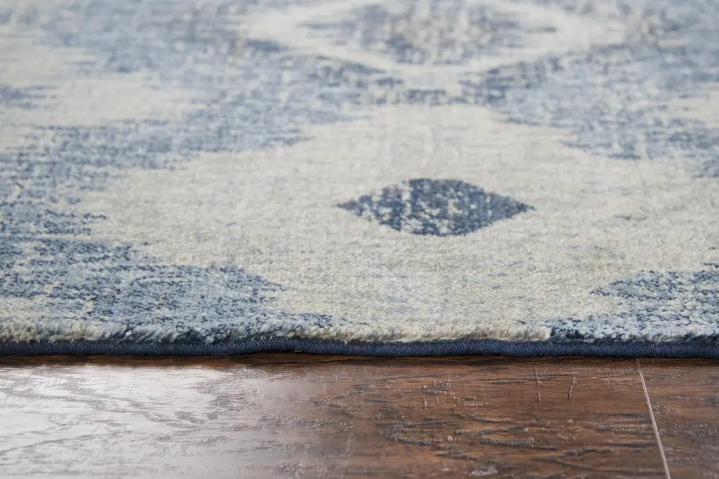 Bring a pop of color into your space with this trendy iKat contemporary style rug. Featuring a geometric pattern of Blues, Grays, and Ivory, this Gossamer collection is made of the finest New Zealand wool. The hybrid construction ensures durability, and the cotton/polyester backing is safe on all floor types. The classic bounded edge gives a beautiful, hand-finished look.