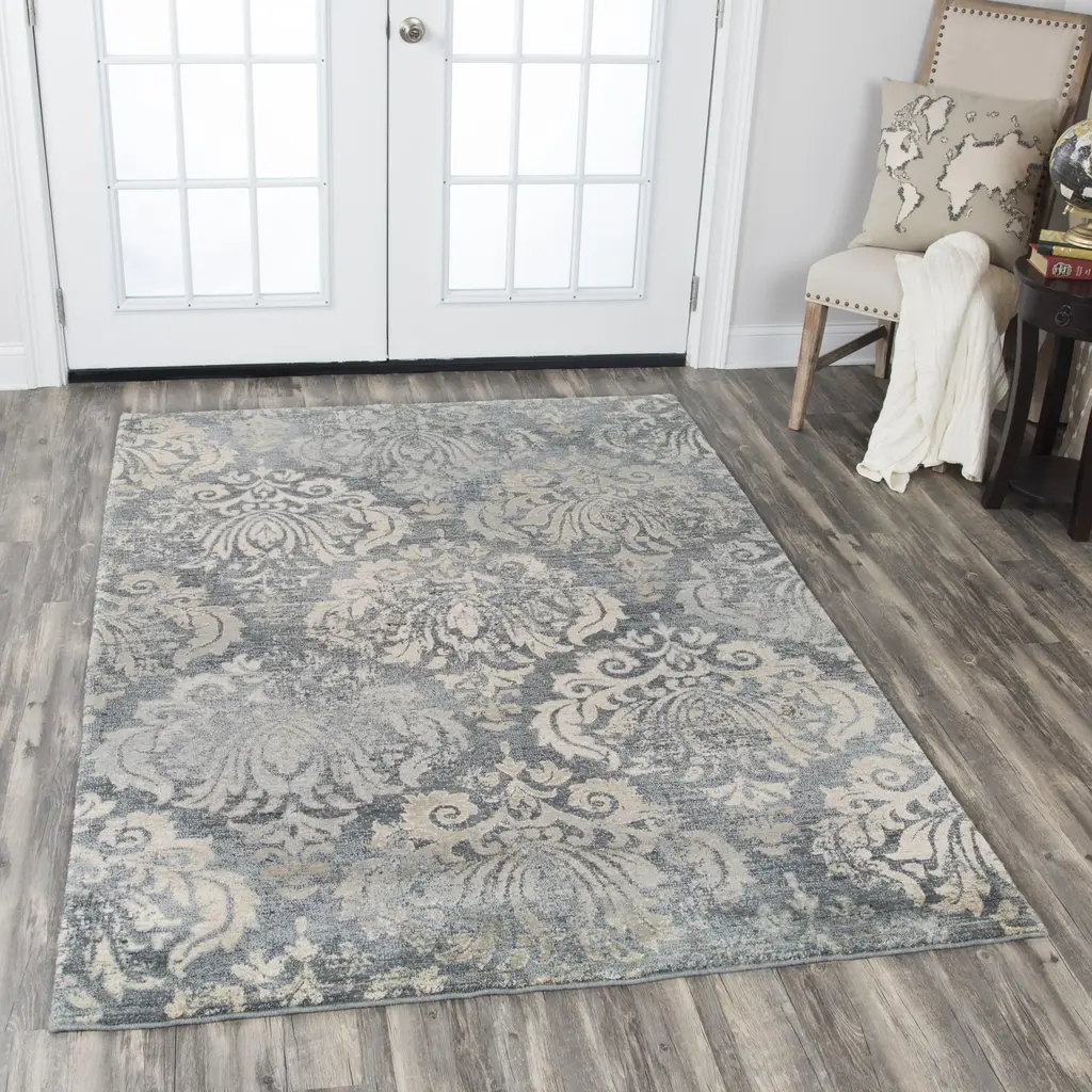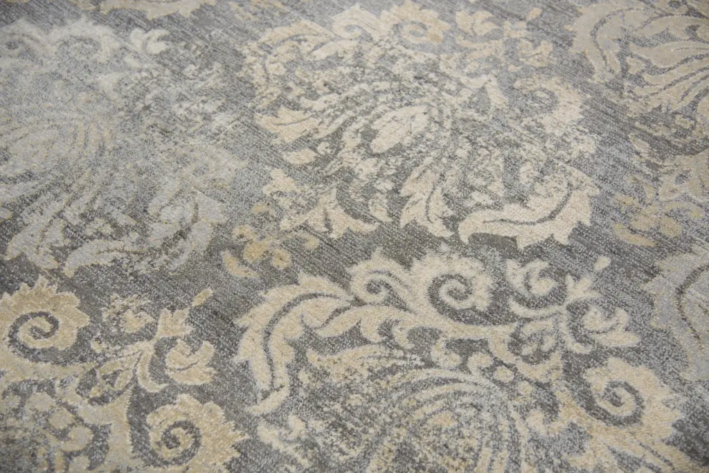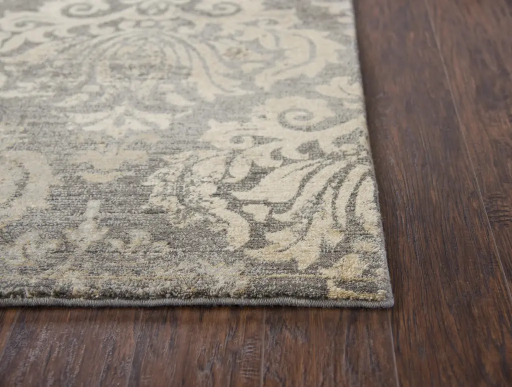 This Gossamer Gray Damask Rug features a pattern of large damask medallions in neutral shades of Gray, Tan, and Beige. Complete your living room or dining room with this transitional, contemporary rug. Hand-washed and hand-finished, this power-loomed rug has a distressed look. This elegant rug is made of 100-percent New Zealand wool and features a bound edge.