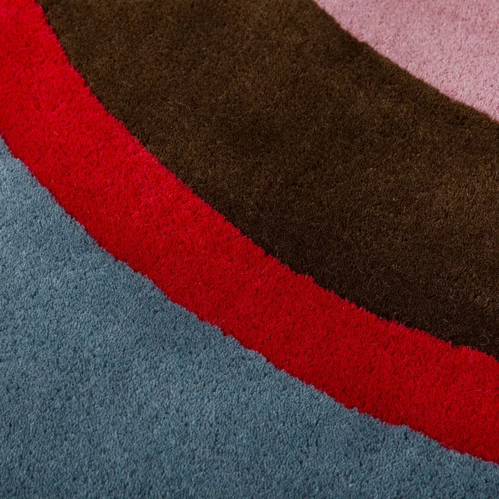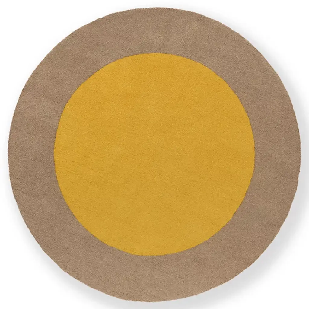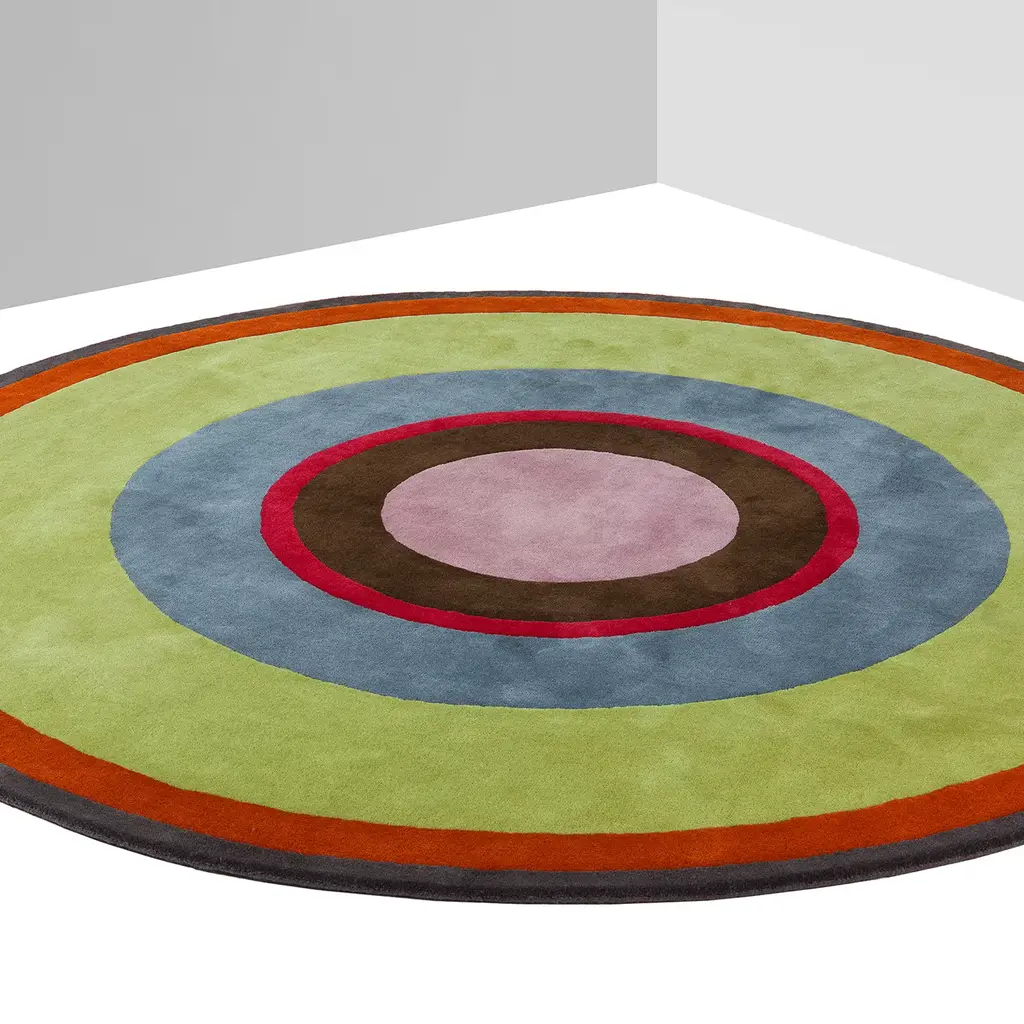 Entirely hand-tufted in India using a blend of wool and viscose, this rug displays a captivating use of color and form. This design by Antonella Negri and Matteo Guaschi (2013) is notable for its symmetry and visual harmony: concentric rings of varying colors and widths radiate outwards to create a three-dimensional work of functional decor. The 100-line diameter has a 10mm-high pile and measures 250 cm in diameter. Available customization in other sizes.