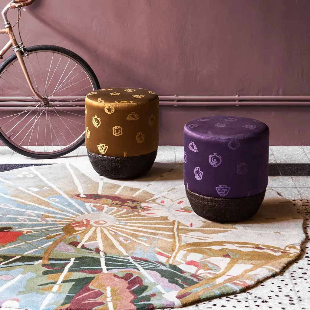 IKE e KOI, in the Japanese language respectively "pond" and "carp" are two pure wool carpets in the shape of old Chinese paper umbrellas made in India by the best artisans. This romantic and iconic object, which in the oniric world represents adaptiveness and luck, leads to a colorful and mysterious world. IKE's dominant colors are the blue of the pond and the carp's red. It is the curiosity of exploration, the entomologist's enthusiasm, and the beauty of movement.
