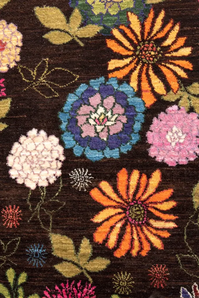 IKEBANA KYOTO 1 is a rectangular wool rug.Zollanvari Super Fine Gabbeh.Zollanvari Studio’s Ikebana Kyoto creations – a design that looks East to Japan and celebrates colour, nature, life – here takes an exotic turn. All things Japanese were all the rage in the late 19th century and greatly inspired and influenced the Art Nouveau and Art Deco movements. But the flow of inspiration worked both ways since these styles travelled back to Japan and in turn influenced meisen kimonos, which used abstract, floral and geometric designs in sophisticated colour combinations. Persian tribal art meets the art of Japanese textile design.