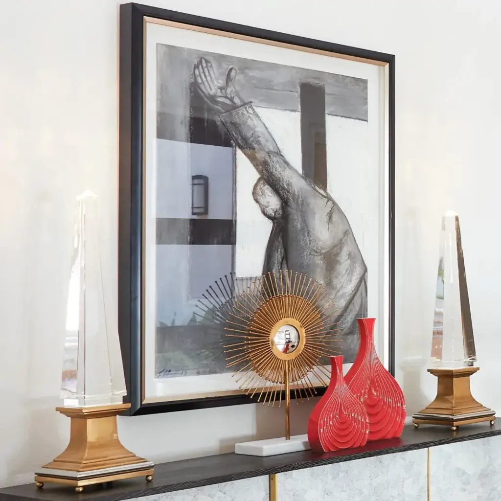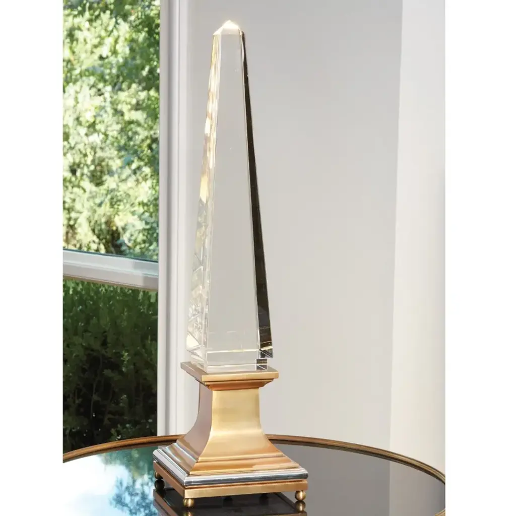 Impressive and glowing, our Illuminated Crystal Obelisk is definitely a show stopper! The solid crystal obelisk sits on top of a brass and nickel finished base that holds an LED bulb that illuminates the crystal beautifully. Please do not place in direct sunlight, crystal can magnify the light of the sun and potentially cause a fire hazard. Small Bubbles within the crystal obelisk is a natural occurrence in solid crystal blocks. Light bulb is included. From a fashion forward perspective, Global Views offers accessories, furniture, statement lighting, and an assortment of rugs and mirrors to add beauty and joy to your home.