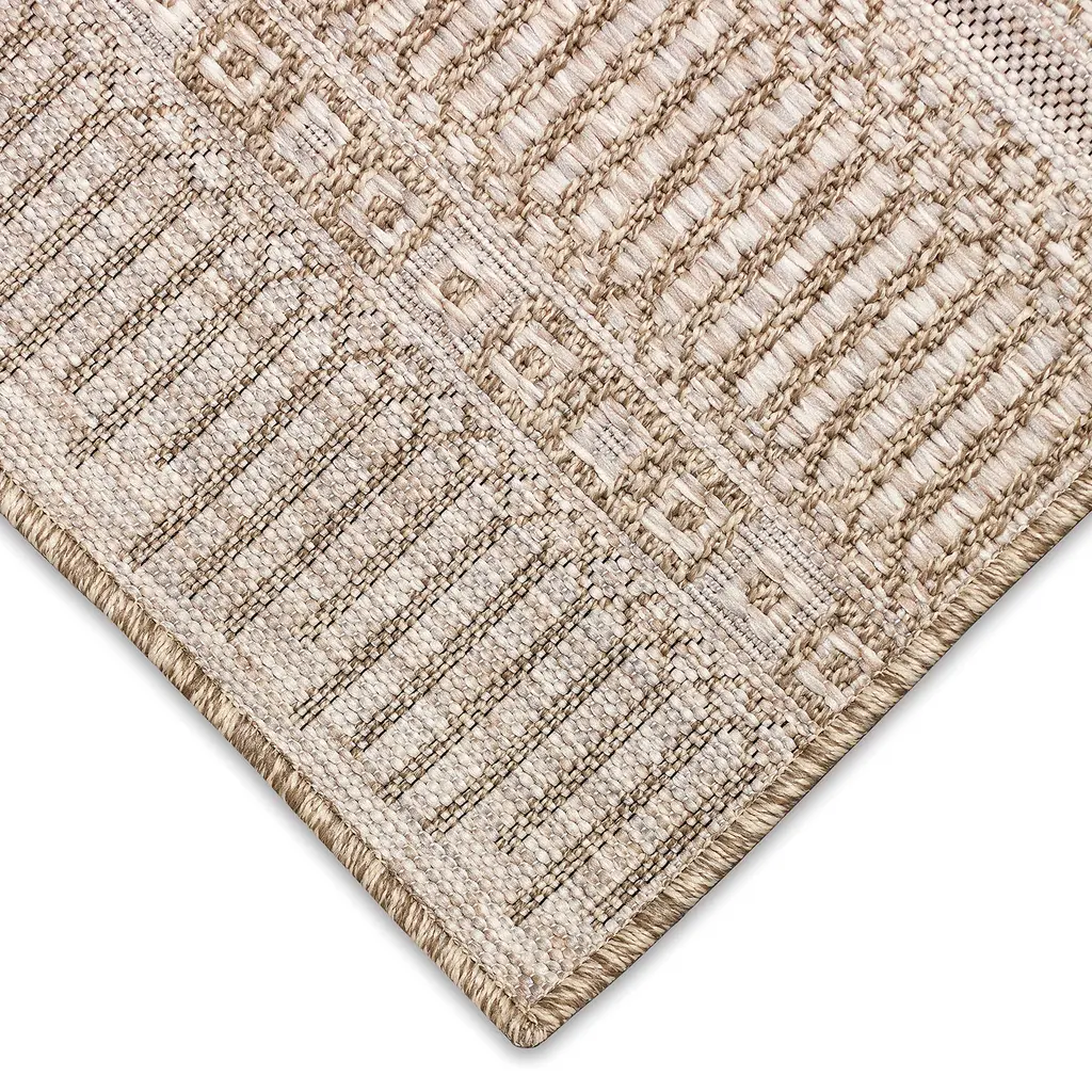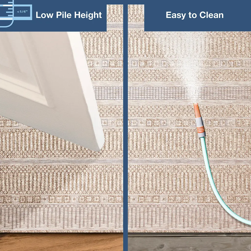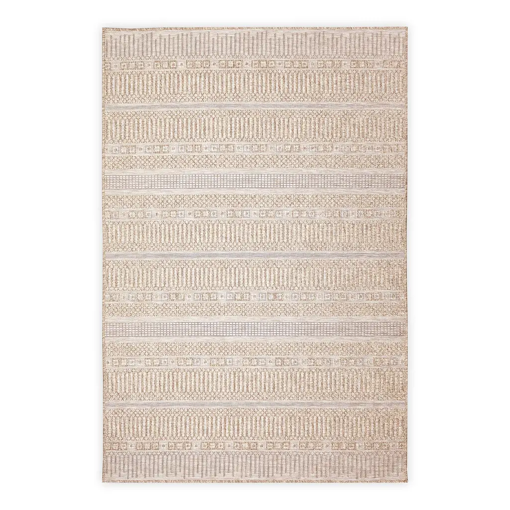 Add texture and comfort to any space with our Indoor/Outdoor Beachcomber Striped Rug. This area rug features a basketweave patterned center with a contrasting striped border adding a rustic textural look to any space, indoor or outdoor. Durable and stylish, this rug creates a relaxed, easy vibe that works with any decor in your home. The rug is flat woven, weather-resistant, and treated for added fade resistance, making this rug perfect for indoor or outdoor placement. Soft and durable, this rug is ideal for your patio, sun room, or those high traffic areas such as your kitchen, living room, entryway, or dining room. Hose clean; air dry completely. Pattern varies slightly by size. Rug pile is approx. ⅛”. Sizes are approximate.
