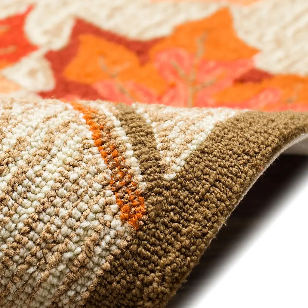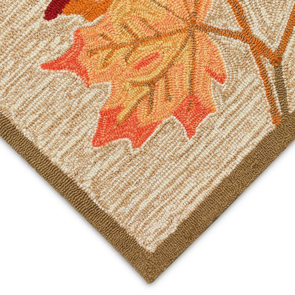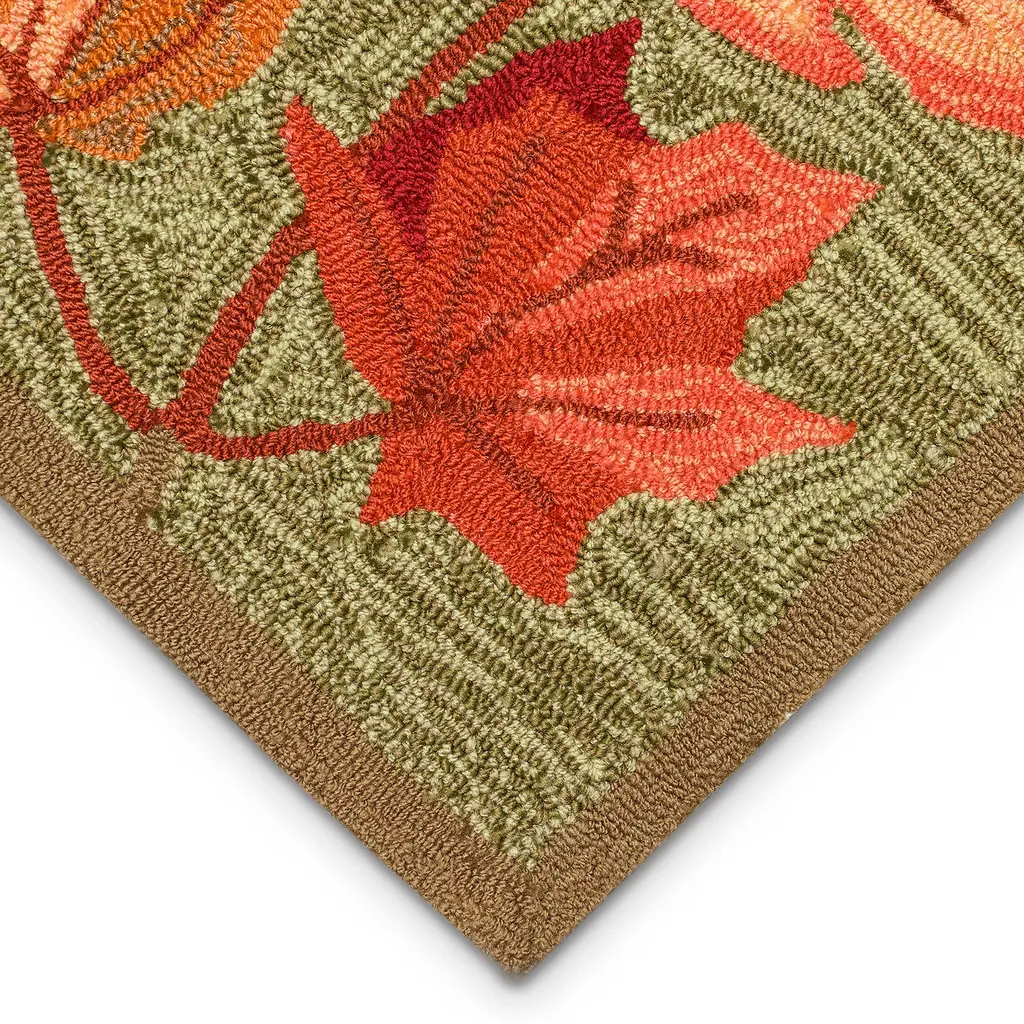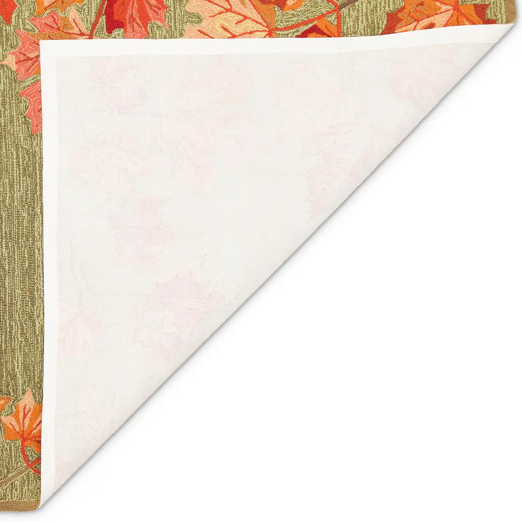 Our hand-hooked Indoor/Outdoor Falling Leaves Border Rug will add beauty, elegance and color to any space. Vivid shades of orange and rust are layered against a finely textured background for a stunning display that forms a perfect foundation for your decor. The rug is flat woven, weather-resistant, and treated for added fade resistance, making this rug perfect for indoor or outdoor placement. Soft and durable, this rug is ideal for your patio, sun room, or those high traffic areas such as your kitchen, living room, entryway, or dining room. Hose clean; air dry completely. Pattern varies slightly by size. Rug pile is approx. ¼”. Sizes are approximate.