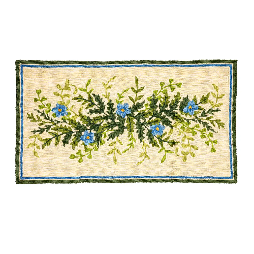 Add a bit of green to your display with our Indoor/Outdoor Fern and Flowers Hooked Polypropylene Accent Rug. This plush rug features small blue flowers amidst the collection of ferns for a botanical look that you’ll love. The contrasting cream background and blue and green border finishes the design for a beautiful accent wherever you place it. Crafted of all-weather polypropylene, this accent rug is mildew and fade resistant, safe to be used indoors or out. Add it to your patio, porch or even by your sink for an instant refresh. Rug features a hooked face with a poly-web canvas backing. Shake out or vacuum (do not use beater attachment) as needed. Spot clean with mild soap/water solution or hose down, then air dry. May also be machine washed. Imported.