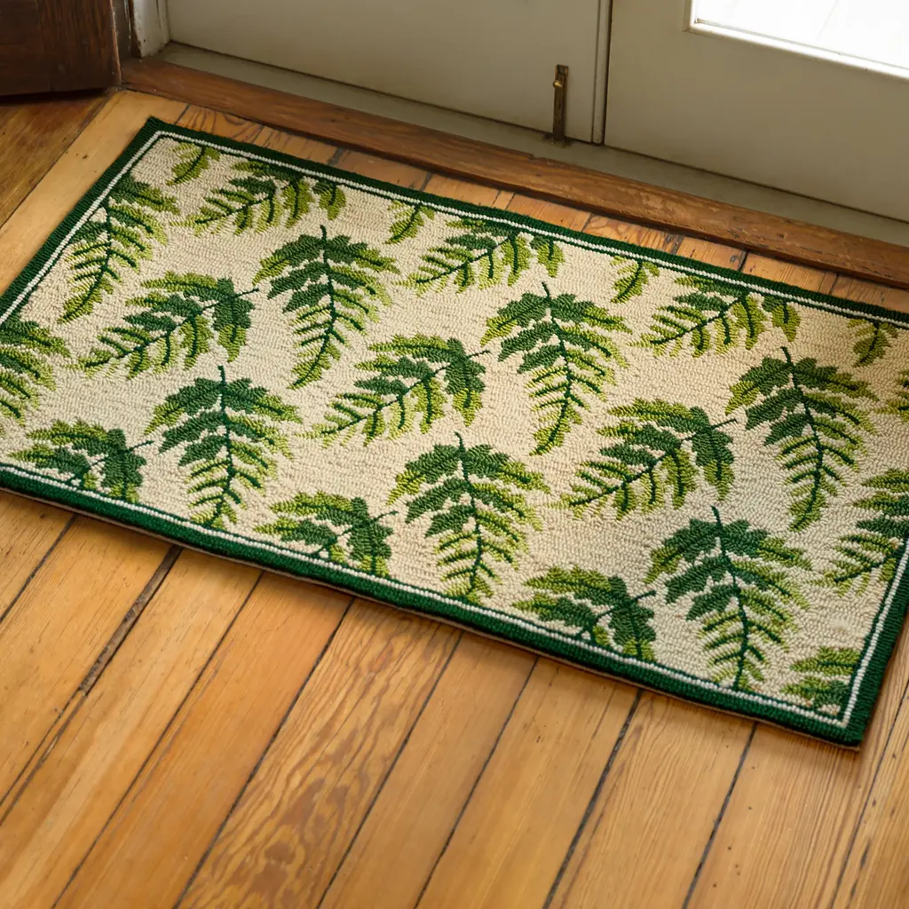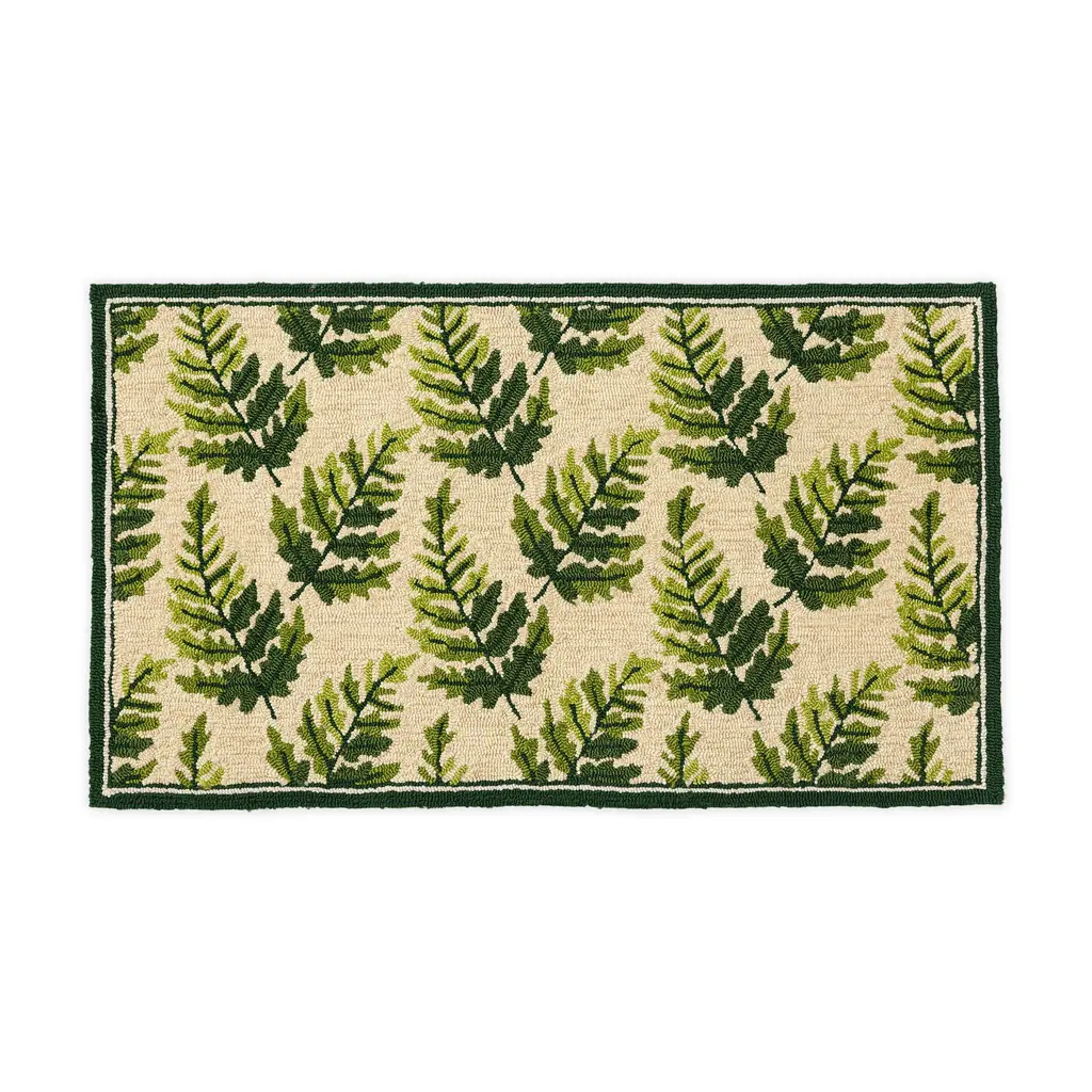 Pretty as a walk through the forest, our Fern Indoor/Outdoor Accent Rug features rich green fern fronds on a neutral background. Hand-hooked rug offers great texture, design and durability. It's perfect in an entryway or mudroom to wipe off muddy paws and boots or out on the deck or porch. Weather-resistant polypropylene hand-hooked rug resists mildew and fading and stands up to heavy traffic. Easy care rug keeps looking great no matter what your boots track in. Shake out, vacuum, spot clean or hose down. Use with a rug pad. Imported.