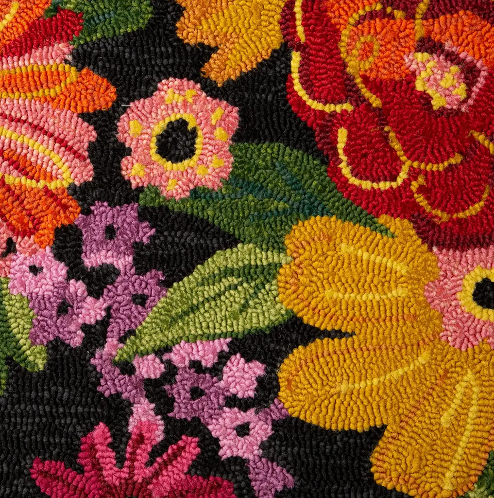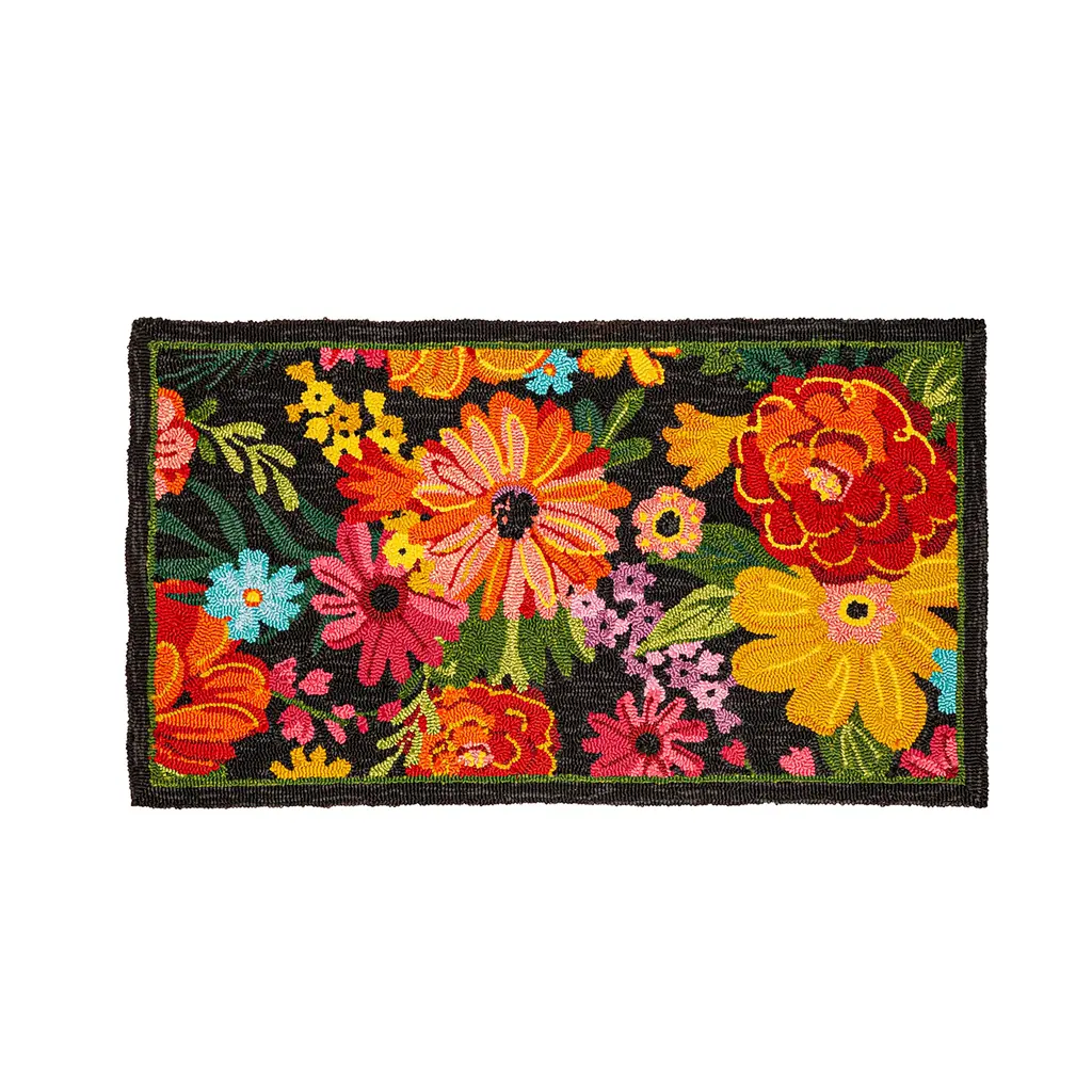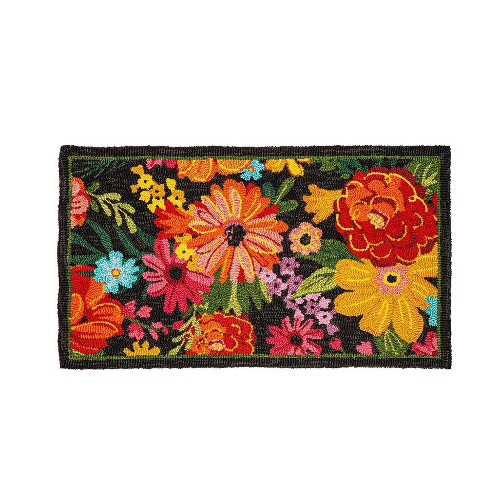 We’re wild about this wildflower rug! Not only is it bursting with color, it can be placed anywhere you like for a versatile display. This pattern also coordinates with our Classic Pillows and Cushions pattern, allowing you to create an all-over look if you desire. Crafted of all-weather polypropylene, this accent rug is mildew and fade resistant, safe to be used indoors or out. Add it to your patio, porch or even by your sink for an instant refresh. Rug features a hooked face with a poly-web canvas backing. Shake out or vacuum (do not use beater attachment) as needed. Spot clean with mild soap/water solution or hose down, then air dry. May also be machine washed. Imported.