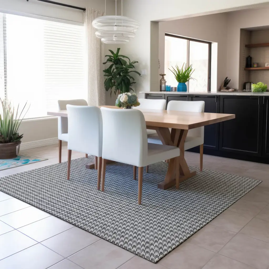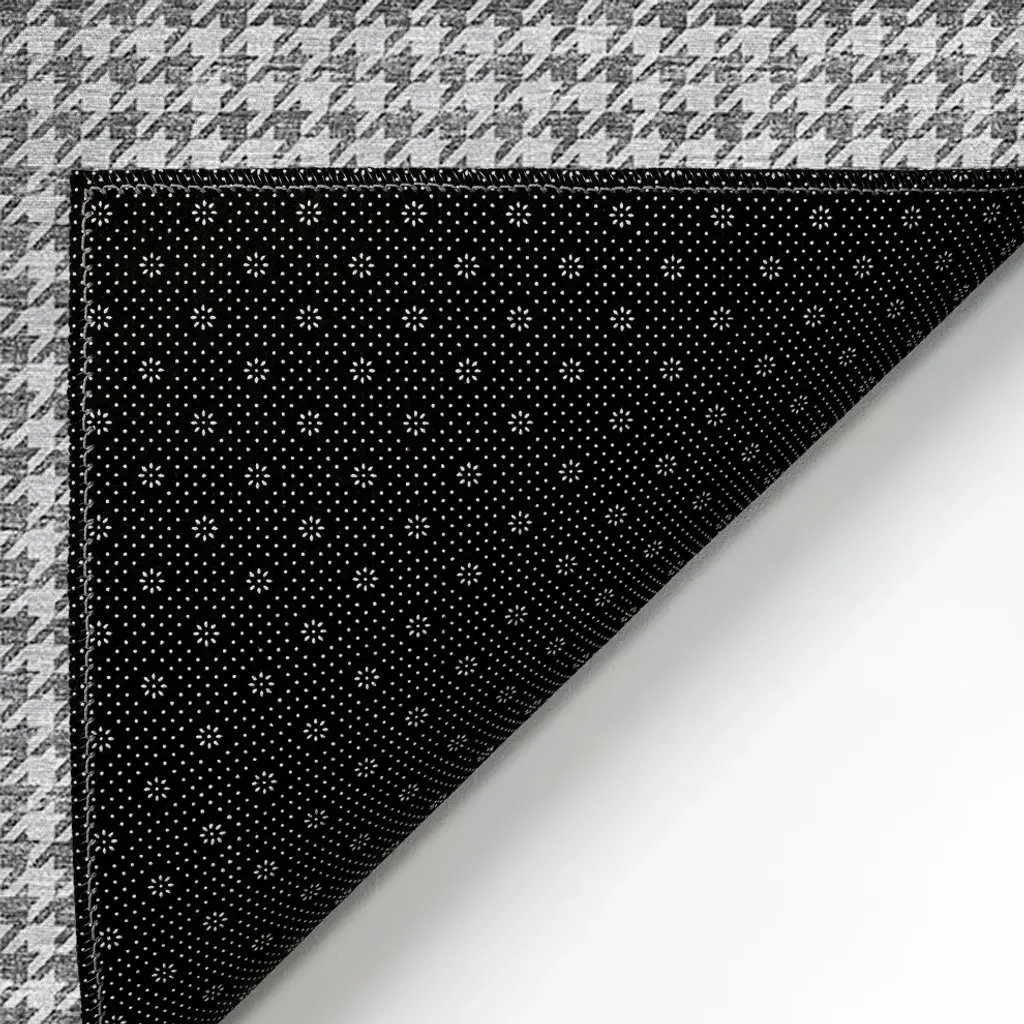 Transform your home with our family and pet-friendly rugs featuring a timeless houndstooth pattern. Designed for convenience, these rugs are UV stabilized for indoor or outdoor use, allowing you to enjoy them in various areas of your home. The ultra-thin, flat-woven chenille profile ensures quicker air-drying after washing, saving you time and effort. Rest assured, the incorporated non-skid backing keeps the rugs securely in place, making them ideal for active households with pets and kids. Machine-Washable For Sizes Under 5� X 7�6�. For Sizes Larger Than 5� X 7�6�, It Is Highly Suggested Using A Commercial Sized Washing Machine. Large Sizes Are Not Suggested For Smaller Home Washing Machines.