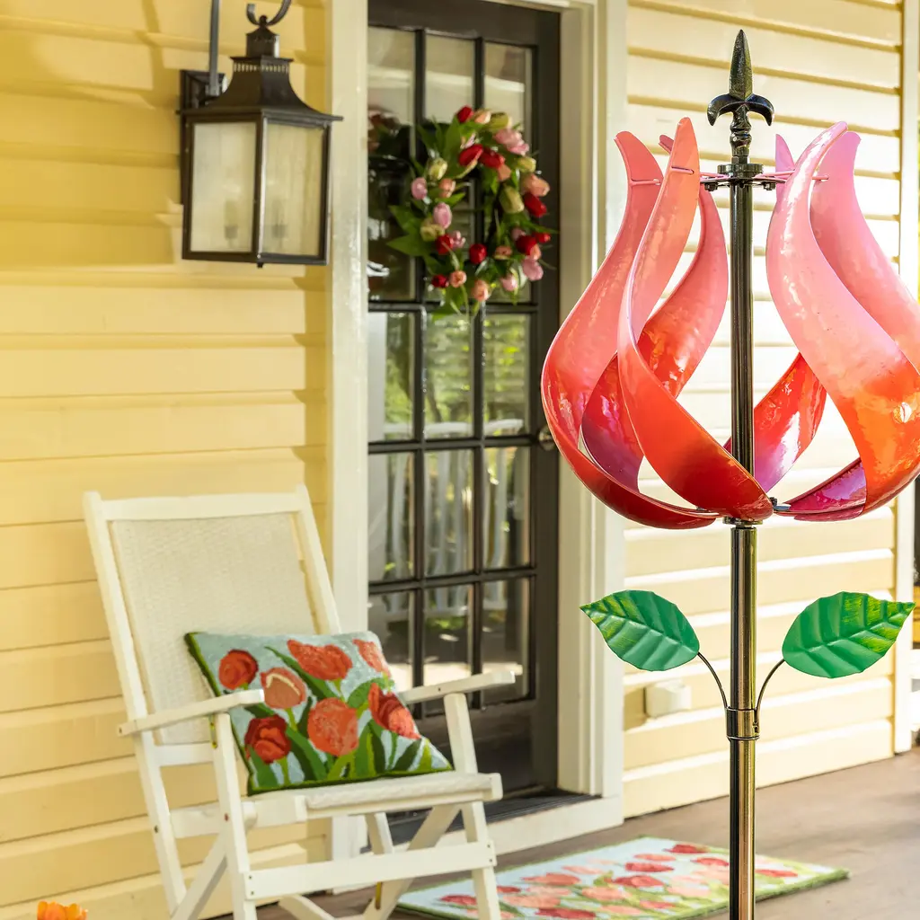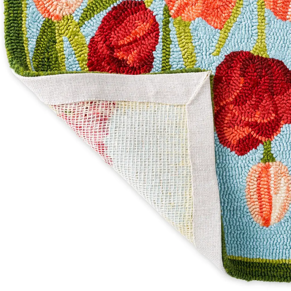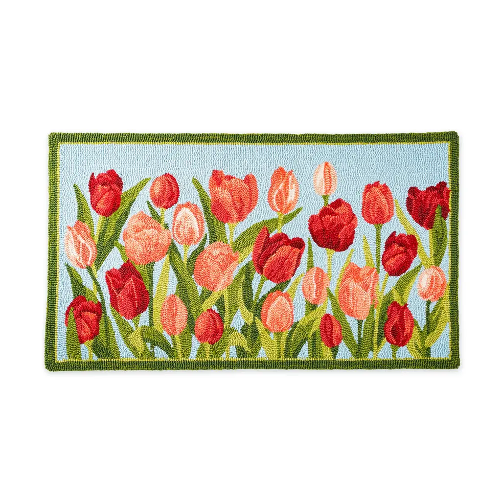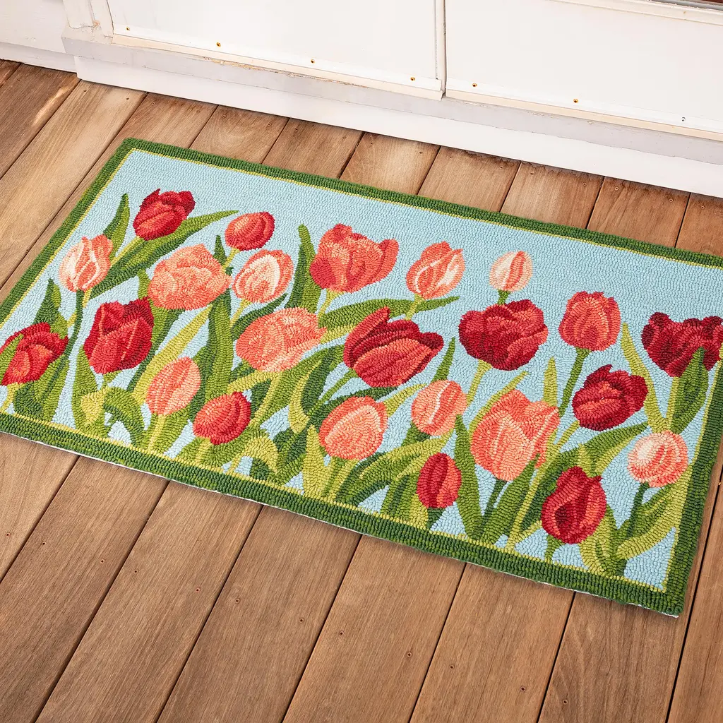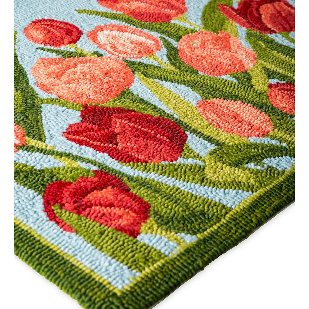 Our Indoor/Outdoor Pink Tulips Accent Rug brings a breath of spring all year long with hand-hooked detailing that's full of texture and color. Ready to greet the season and visitors, this rug's charming tulip design in vibrant shades of pink on a calming sky blue background brings a fresh look to your home. Made of 100% polypropylene, this decorative rug is mildew and fade resistant, beautiful yet durable enough to use indoors and out. It's guaranteed to add instant style to your front door, porch, mudroom or kitchen. Polypropylene rug is easy-care: vacuum, spot clean or hose down, then air dry completely. Imported.