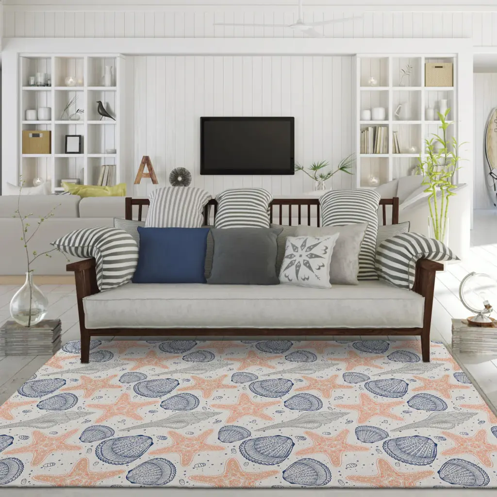 Remarkable Seabreeze collection has been created to inspire tranquility. Wow your guests with these versatile casual coastal rugs, stylish flat weave rug features vibrant colors with gradient movement in a variety of natural beach mosaic shapes and patterns. Featuring an ultra-soft and ultra thin pile, each rug is made with 100% polyester pile complete with a non-skid backing. Final crafting in USA using domestic processing on an imported substrate. They are UV Stabilized for indoor and cover outdoor spaces. Shake out or use straight suction with vacuum, do not use a beater bar. Machine washable in cold water and air dry, some sizes may be too large for a residential washing machine and is family and pet friendly.