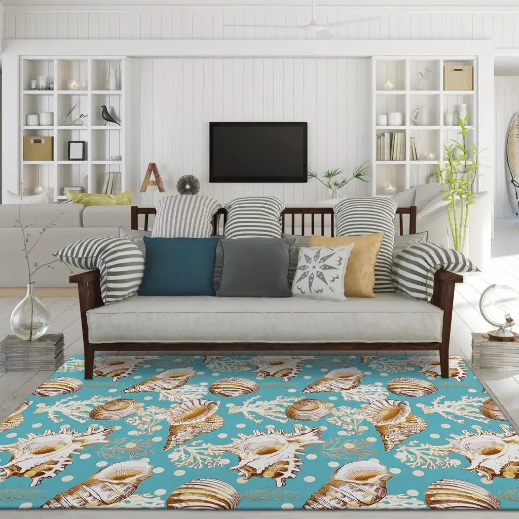 Remarkable Seabreeze collection has been created to inspire tranquility. Wow your guests with these versatile casual coastal rugs, stylish flat weave rug features vibrant colors with gradient movement in a variety of natural beach mosaic shapes and patterns. Featuring an ultra-soft and ultra thin pile, each rug is made with 100% polyester pile complete with a non-skid backing. Final crafting in USA using domestic processing on an imported substrate. They are UV Stabilized for indoor and cover outdoor spaces. Shake out or use straight suction with vacuum, do not use a beater bar. Machine washable in cold water and air dry, some sizes may be too large for a residential washing machine and is family and pet friendly.