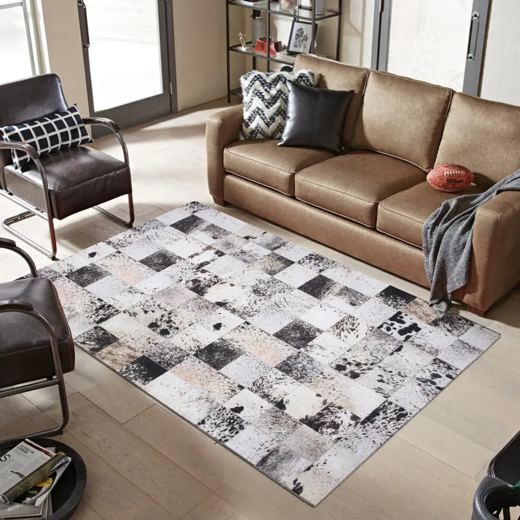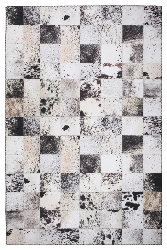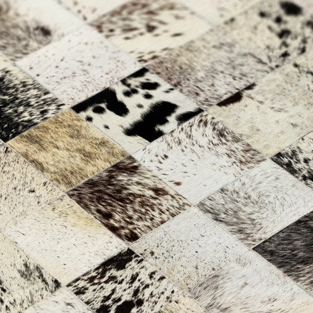 Durango is a faux hide patchwork collection. The details on these faux hide rugs look so real you will wow your guests. This stylish rug features neutral colors with gradient movement in a variety of mosaic shapes and patterns. Featuring an ultra-soft and ultra thin pile, each rug is made with 100% polyester pile complete with a non-skid backing. Final crafting in USA using domestic processing on an imported substrate. They are UV Stabilized for indoor and cover outdoor spaces. Shake out or use straight suction with vacuum, do not use a beater bar. Machine washable in cold water and air dry, some sizes may be too large for a residential washing machine and is family and pet friendly.
