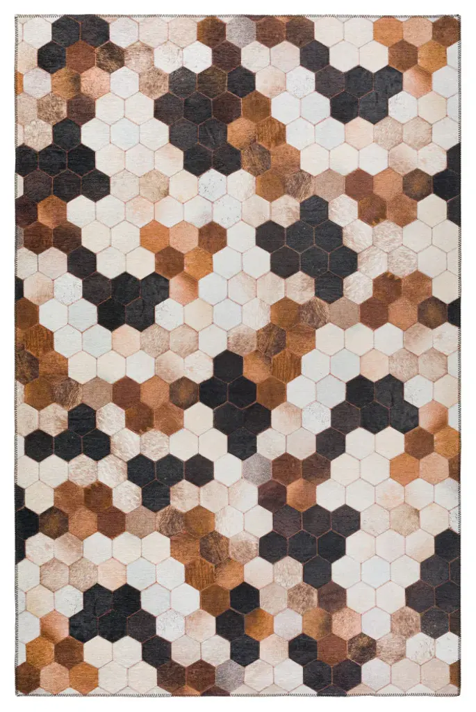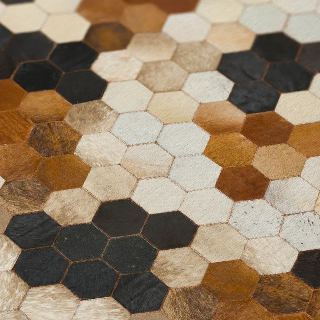 Durango is a faux hide patchwork collection. The details on these faux hide rugs look so real you will wow your guests. This stylish rug features neutral colors with gradient movement in a variety of mosaic shapes and patterns. Featuring an ultra-soft and ultra thin pile, each rug is made with 100% polyester pile complete with a non-skid backing. Final crafting in USA using domestic processing on an imported substrate. They are UV Stabilized for indoor and cover outdoor spaces. Shake out or use straight suction with vacuum, do not use a beater bar. Machine washable in cold water and air dry, some sizes may be too large for a residential washing machine and is family and pet friendly.