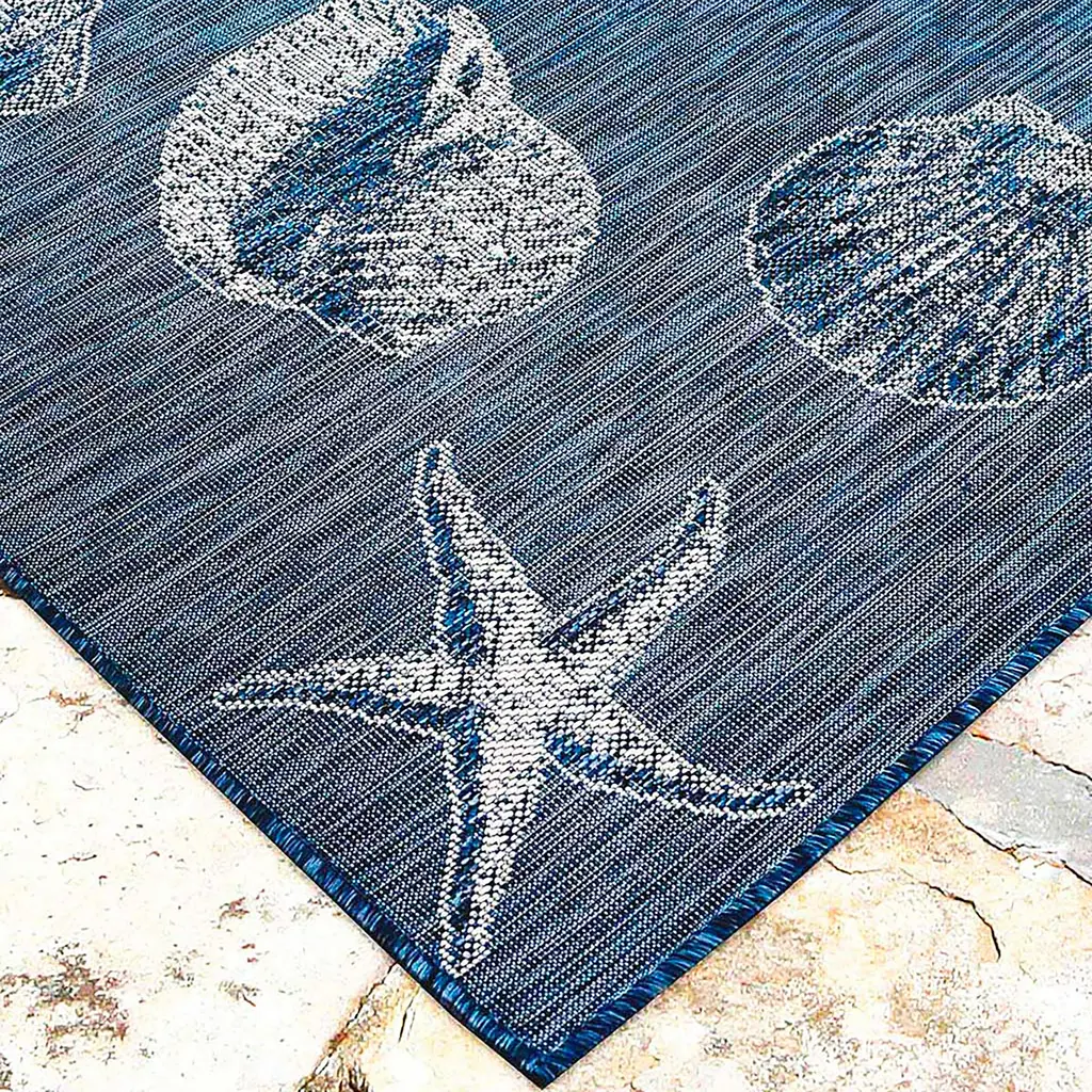 This Indoor/Outdoor Textured Shells Polypropylene Rug has the beauty and softness of a traditional pile rug, but it's made of 100% polypropylene to stand up to high traffic indoors and out. The whimsical design of seashells and starfish mixes complementary colors to create a look that will fit with any setting or furniture while adding just a touch of tropical flair. The yarn is space-dyed in multiple shades per strand, giving it a dimensional look, greater detail in the design and the ability to blend beautifully with any style.This handsome rug is versatile, colorful and functional. Durable enough to withstand heavy traffic, kids and pets, it's perfect for any area: porch, patio, sun room, kitchen and more. Hose clean. Pattern varies slightly by size. Rug pile is approx. ¼"H. Sizes are approximate. Imported.