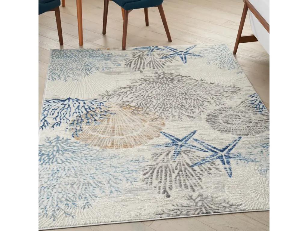 This Indoor/Outdoor Textured Shells Polypropylene Rug has the beauty and softness of a traditional pile rug, but it's made of 100% polypropylene to stand up to high traffic indoors and out. The whimsical design of seashells and starfish mixes complementary colors to create a look that will fit with any setting or furniture while adding just a touch of tropical flair. The yarn is space-dyed in multiple shades per strand, giving it a dimensional look, greater detail in the design and the ability to blend beautifully with any style.This handsome rug is versatile, colorful and functional. Durable enough to withstand heavy traffic, kids and pets, it's perfect for any area: porch, patio, sun room, kitchen and more. Hose clean. Pattern varies slightly by size. Rug pile is approx. ¼"H. Sizes are approximate. Imported.