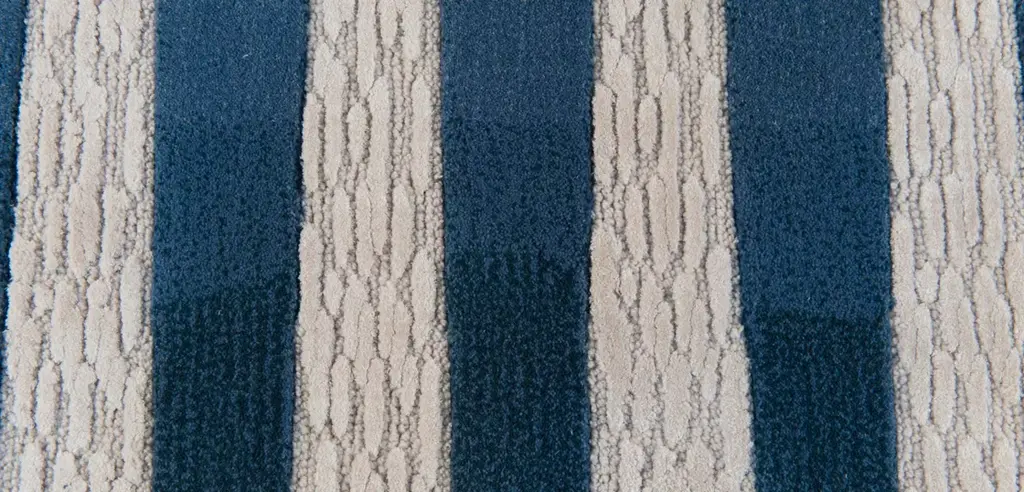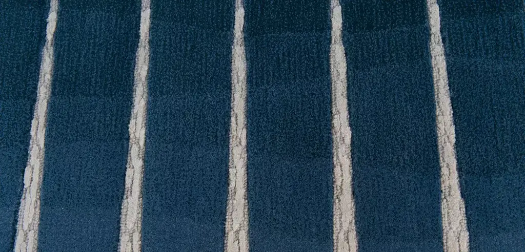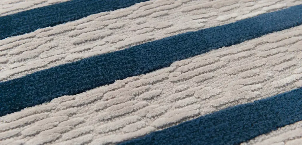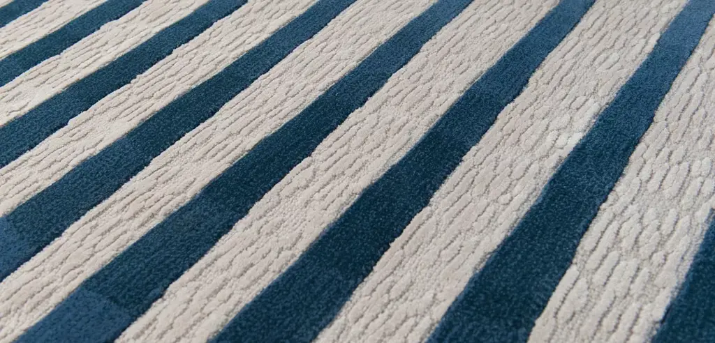 The Infinity rug features a graphic and geometric design that is softened by the combination of textures and ripples in various shades of blue. By positioning two identical rugs side by side, the lines stretch and refocus to infinity, reminiscent of a Backgammon board.