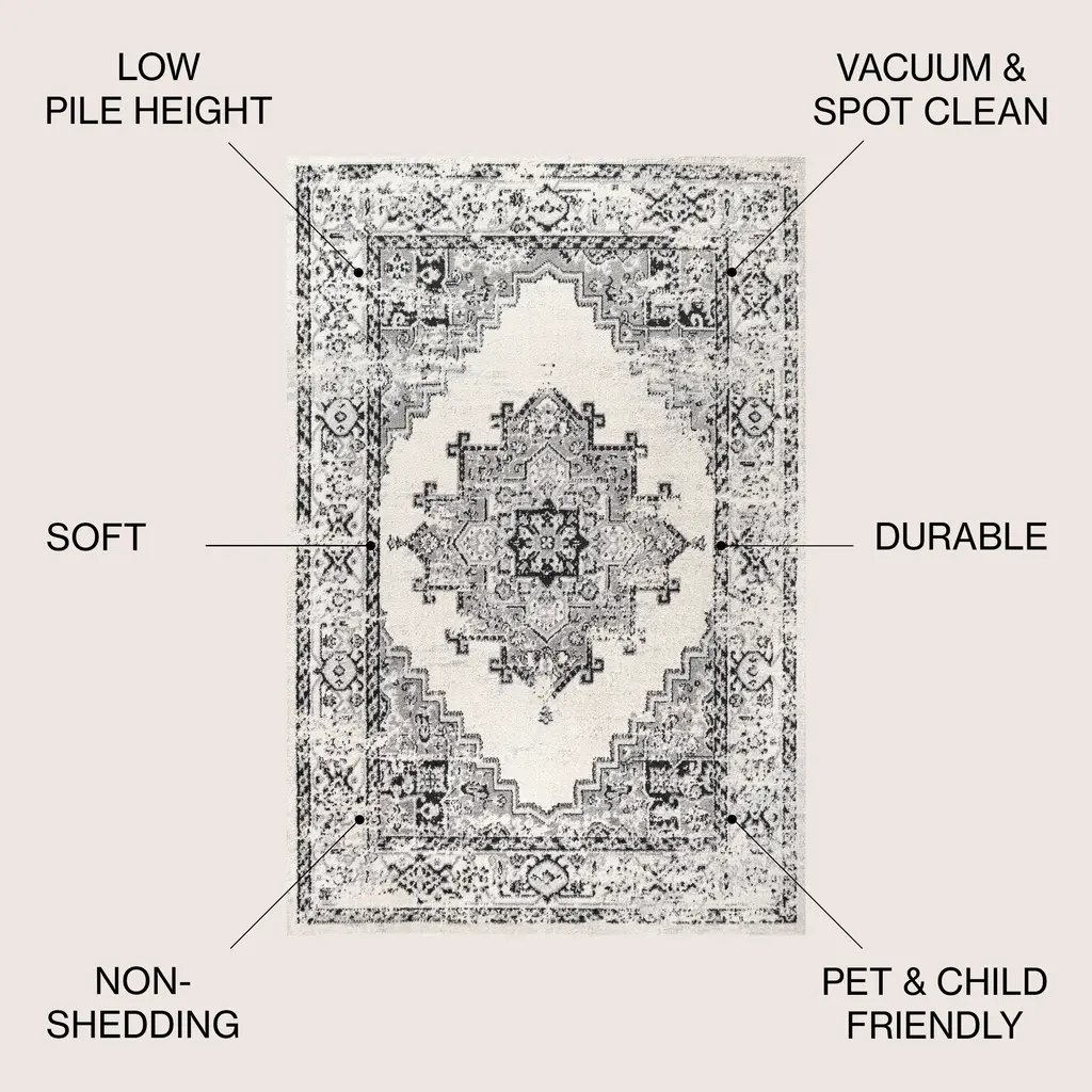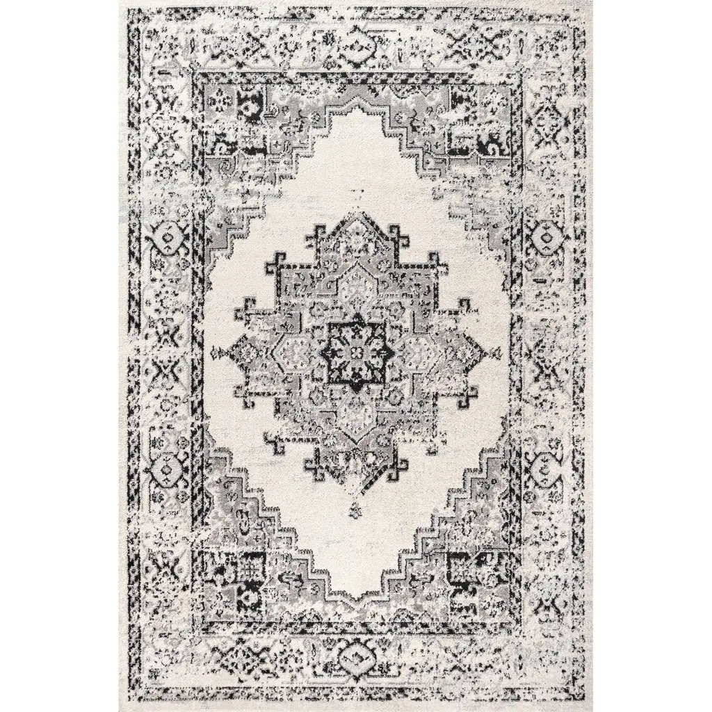 The diamond-shaped medallion in the center of this rug's design recalls ancient geometric tribal rugs. The neutral ivory and charcoal gray color scheme adds a modern update to a classic design. With its Bohemian-inspired, minimalist design this rug would be perfect for a dining room, living room, entry or bedroom.