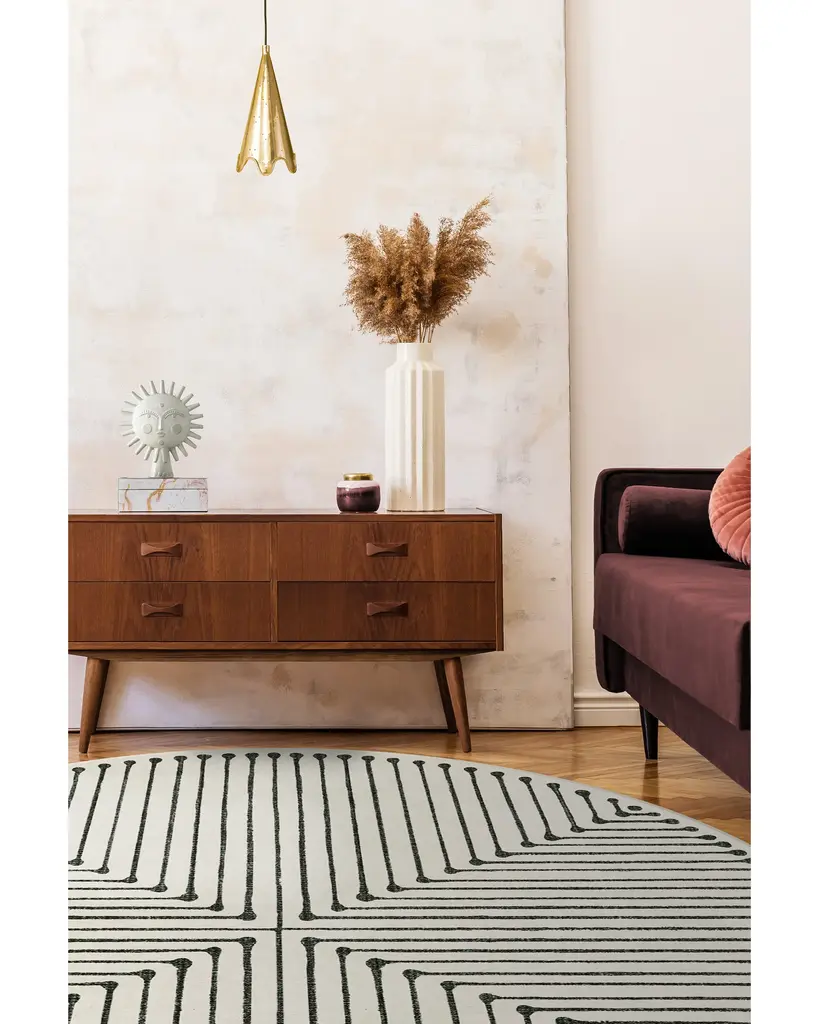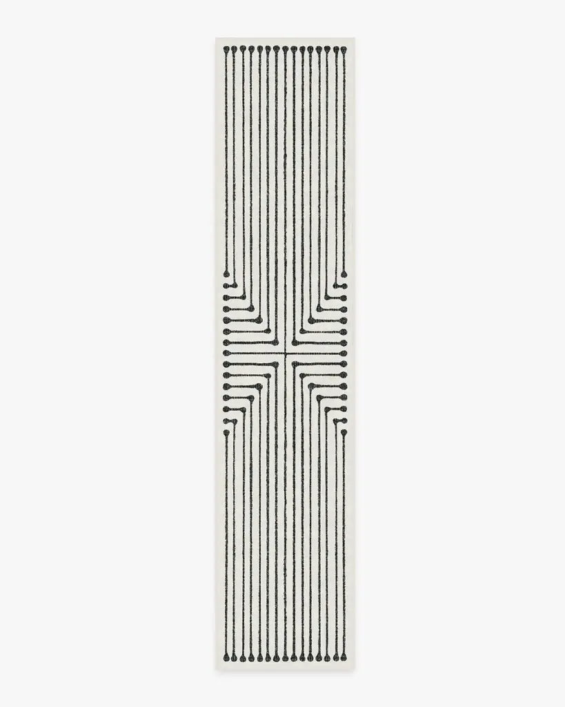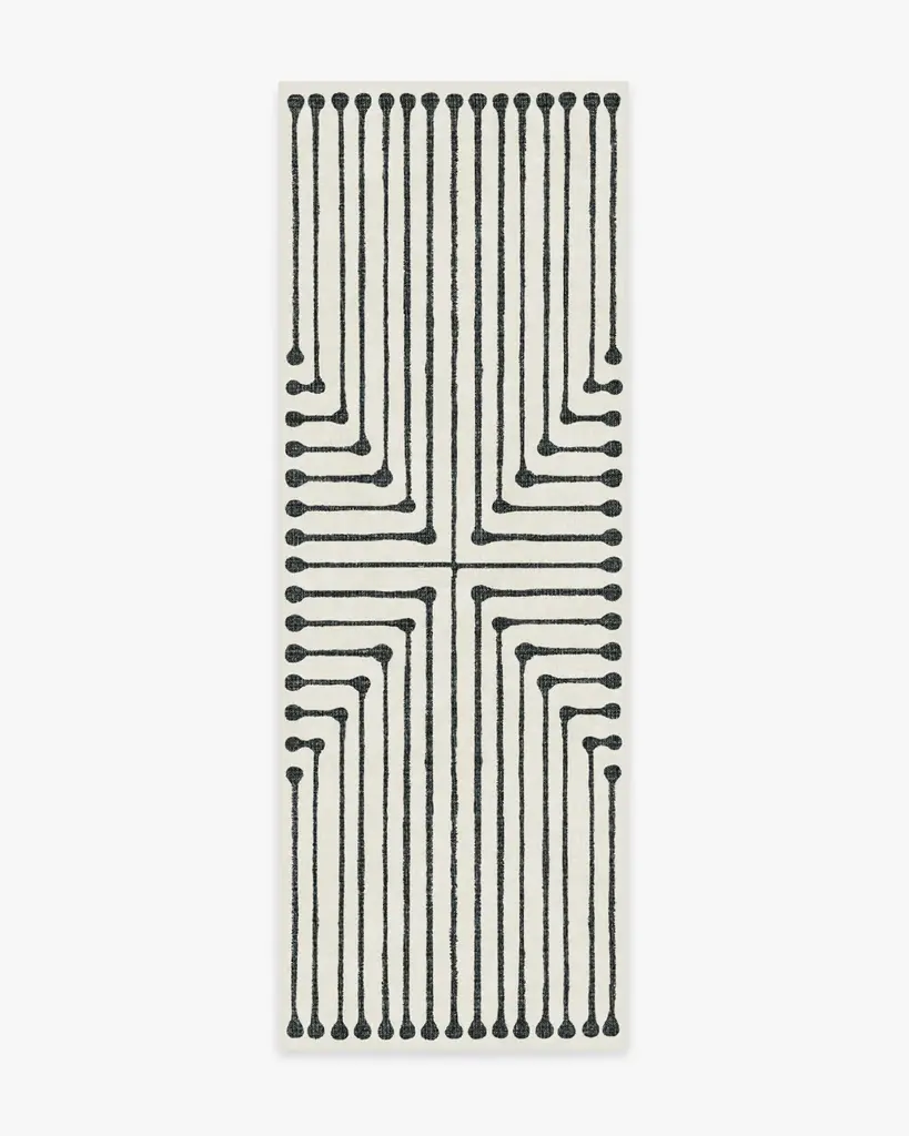 Stripes get a chic makeover. Ink-inspired lines form a striped, geometric pattern on this black and ivory rug. Water-resistant, stain-resistant, and machine-washable.