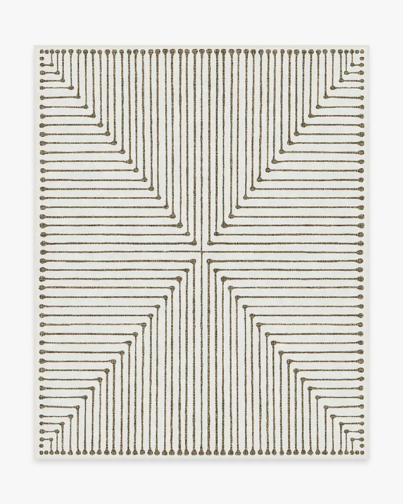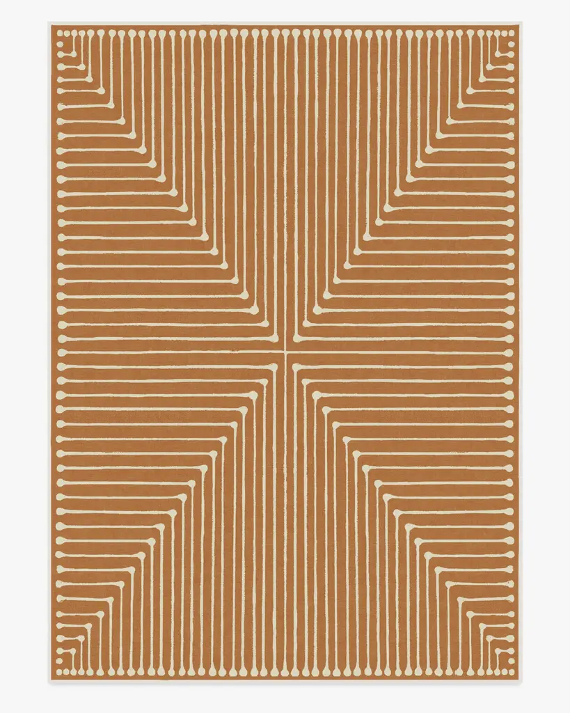 Elevate a warm oak floor. This versatile geometric rug can dress up any space with its simple pattern, glammed up by ink-inspired lines in camel brown on an ivory background. Water-resistant, stain-resistant, and machine-washable.