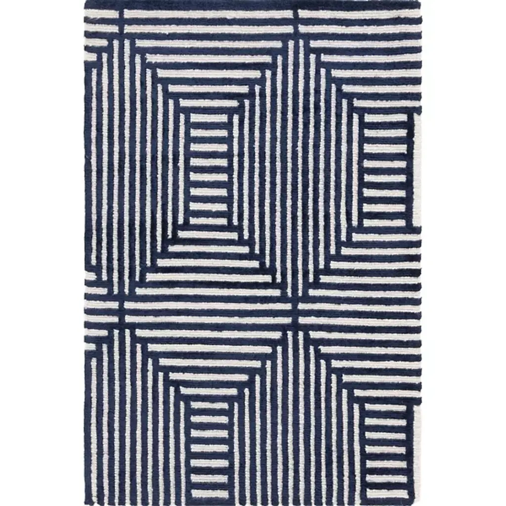 Stripes in a moody blue hue. Ink-inspired lines in ivory form striped triangle patterns on our Jonathan Adler Inkdrop Lapis Blue Rug. Water-resistant, stain-resistant, and machine-washable.