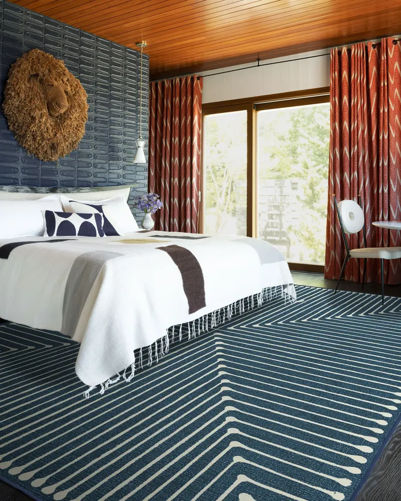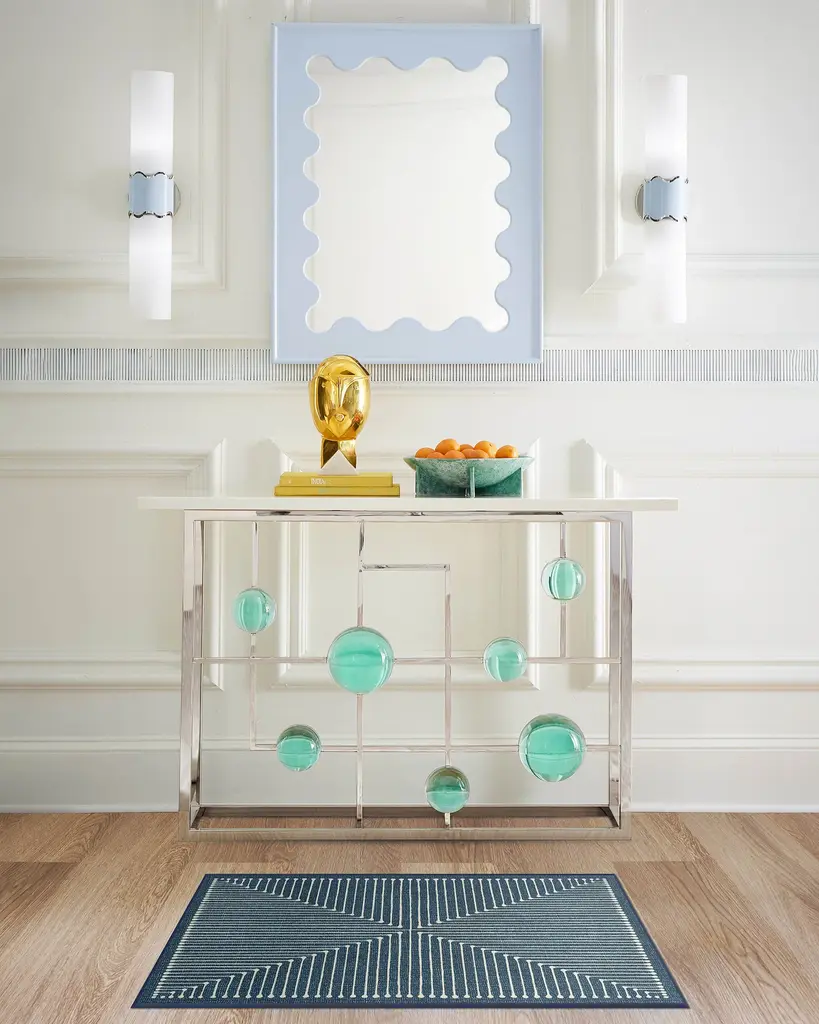 Stripes in a moody blue hue. Ink-inspired lines in ivory form striped triangle patterns on our Jonathan Adler Inkdrop Lapis Blue Rug. Water-resistant, stain-resistant, and machine-washable.