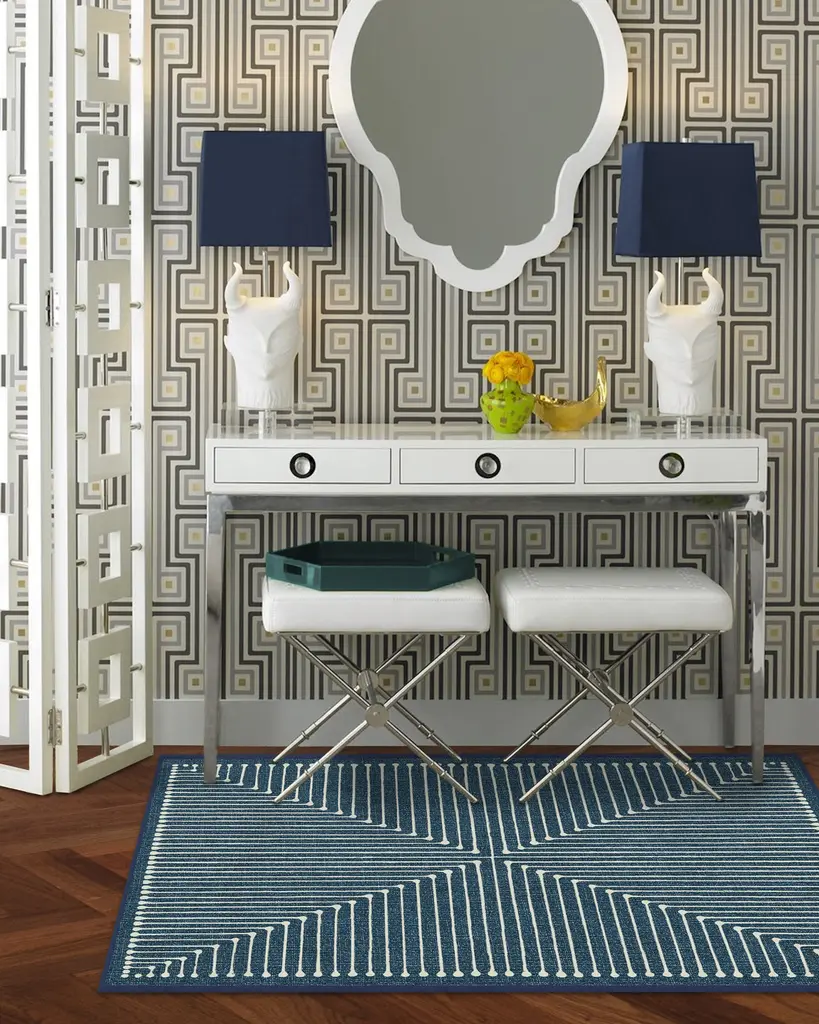 Stripes in a moody blue hue. Ink-inspired lines in ivory form striped triangle patterns on our Jonathan Adler Inkdrop Lapis Blue Rug. Water-resistant, stain-resistant, and machine-washable.