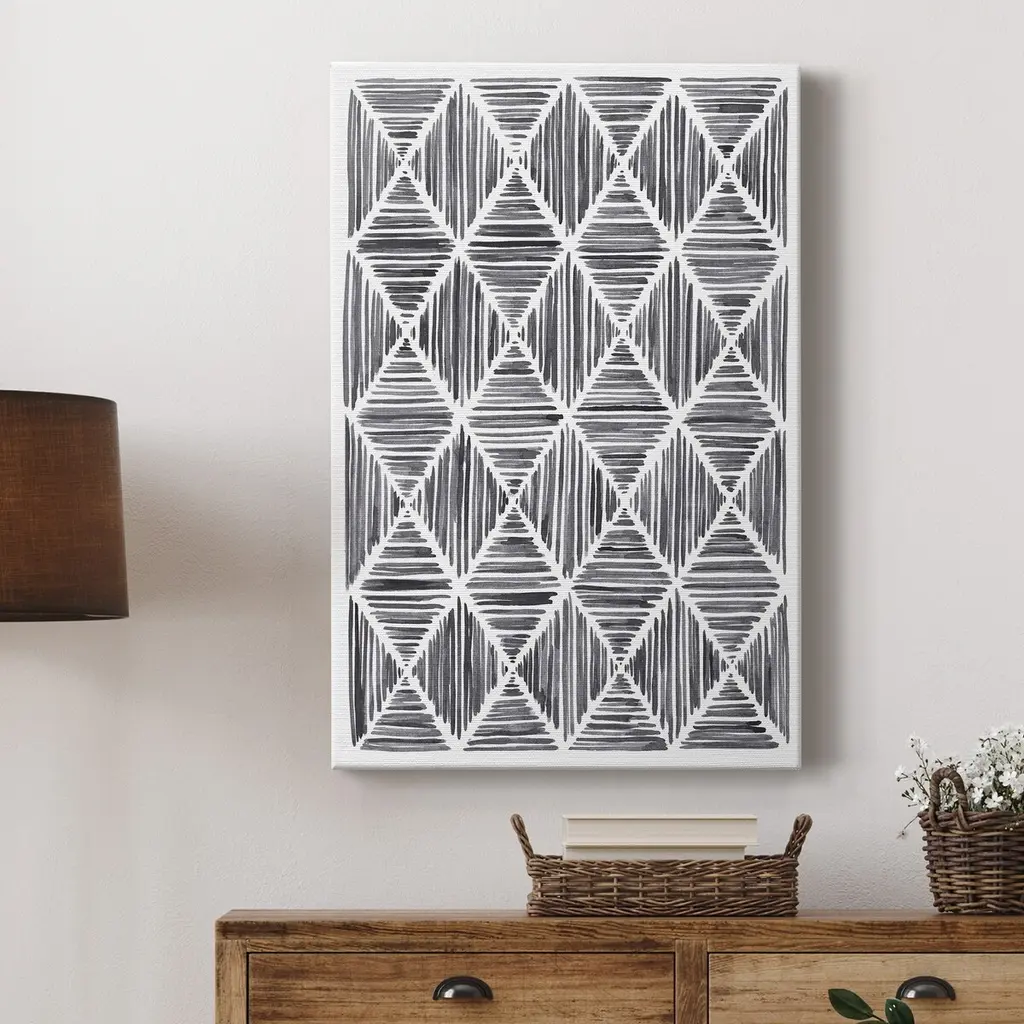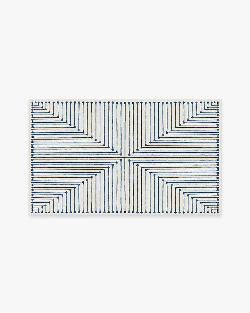 Effortlessly glam. Ink-inspired lines make up a striking triangular design on this geometric rug, beautifully done in shades of dark and light blue on an ivory background. Water-resistant, stain-resistant, and machine-washable.