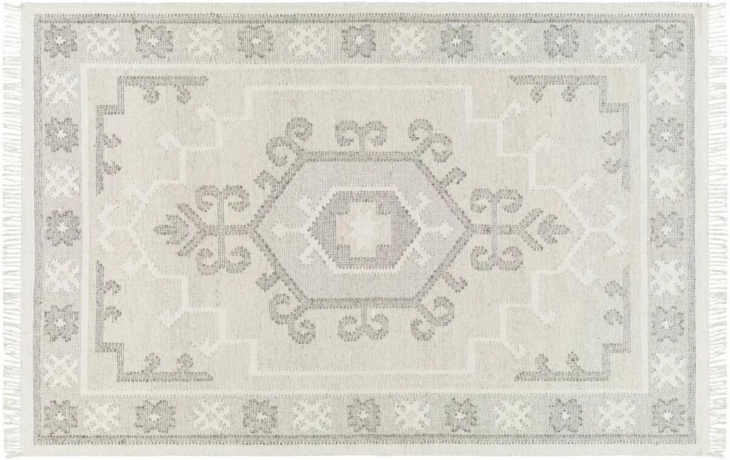 Elevate your space with our exquisite 6' X 9' medium rectangle area rug, finely crafted in India through the traditional Hand Tufted technique. This rug showcases an elegant light grey/grey palette, imbued with a harmonious blend of traditional motifs that evoke timeless sophistication. Made from the luxurious softness of wool, this piece boasts a dense pile height of 1/2", providing a plush underfoot experience. Its intricate pattern, as seen in the image, features gracefully stylized flora and geometrics, encased by a delicate border that frames and enhances its aesthetic appeal. Perfect for adding a touch of understated elegance to any room, this rug promises durability and comfort, making it an ideal choice for creating a serene and inviting atmosphere in your home.