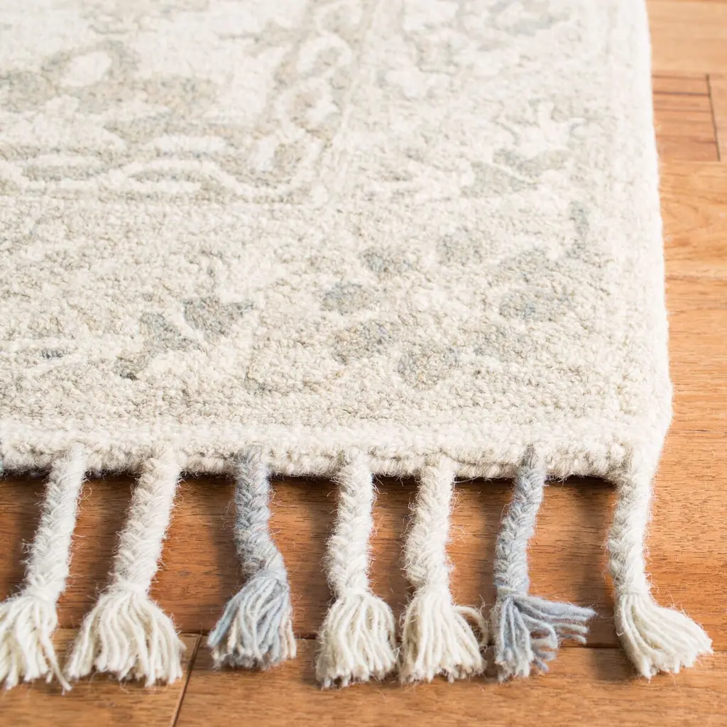 Elevate your space with our exquisite 6' X 9' medium rectangle area rug, finely crafted in India through the traditional Hand Tufted technique. This rug showcases an elegant light grey/grey palette, imbued with a harmonious blend of traditional motifs that evoke timeless sophistication. Made from the luxurious softness of wool, this piece boasts a dense pile height of 1/2", providing a plush underfoot experience. Its intricate pattern, as seen in the image, features gracefully stylized flora and geometrics, encased by a delicate border that frames and enhances its aesthetic appeal. Perfect for adding a touch of understated elegance to any room, this rug promises durability and comfort, making it an ideal choice for creating a serene and inviting atmosphere in your home.