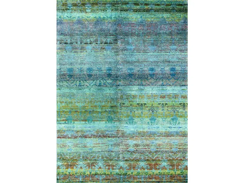 Iridescence Fish Scales 1 is a rectangular wool and silk carpet.Zollanvari Super Fine Gabbehs.Bulurbaft, the most ‘classical’ design carpets, are woven in the province of Kurdistan. ‘Bulur’ is Farsi for ‘brilliant’ or ‘precise’, an apt definition for these finely woven carpets that are similar to traditional Bijar carpets in quality and weave. The designs draw inspiration from old Senneh carpets, but refreshed and updated the colour palette to suit modern sensibilities. The Luribaft carpets are knotted by Luri tribesmen or by Ghashgha’i women married into the tribe. The designs are passed down from generation to generation or are recreated using ancient Luri ornaments as templates, since some archaic motifs had vanished from their repertoire. Until the 1950s the Luri tribes worked exclusively with vegetable dyes. The emergence of chemical dyes, mainly from Germany, made it easier to dye wool, but led to a loss of the intrinsic character of these fine carpets. In the 1980s Zollanvari forced a return to the ancient vegetable dyeing techniques and thereby revived the allure of these carpets.