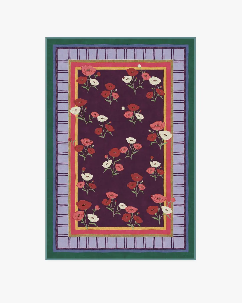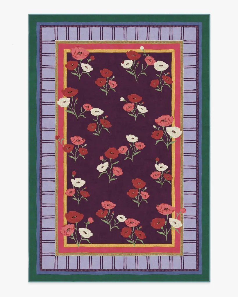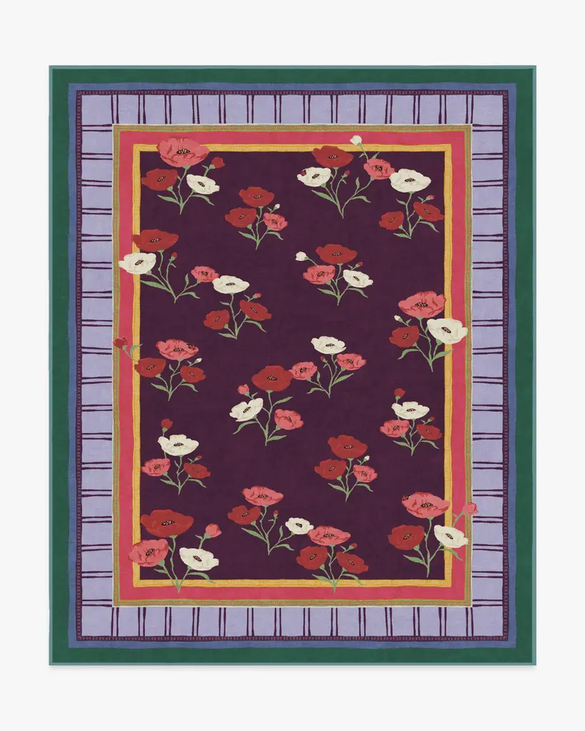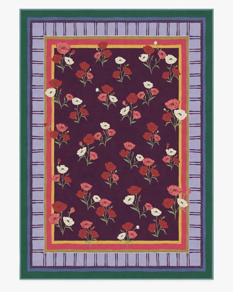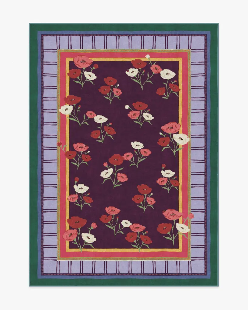 BACK BY POPULAR DEMAND: Step into a garden of creativity with our Limited Edition Iris Apfel Ambroeus Royal Plum Rug. Inspired by Iris' collection of vintage textiles and heirloom, hand-painted scarves, this blooming design features delicate floral motifs with ladybugs hidden among the petals. An intricate border with varied line widths complements the crimson, pink, and white poppies that stretch beautifully against a royal plum background. Bright marigold yellow, pink, light purple, and deep blue-green blend in the lively-colored border. Water-resistant, stain-resistant, and machine-washable. Rug colors may vary slightly according to your device and the lighting in your space.