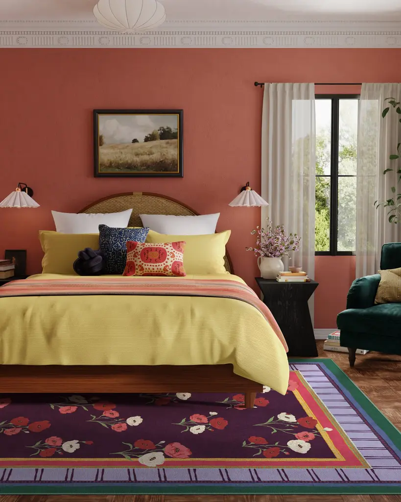 BACK BY POPULAR DEMAND: Step into a garden of creativity with our Limited Edition Iris Apfel Ambroeus Royal Plum Rug. Inspired by Iris' collection of vintage textiles and heirloom, hand-painted scarves, this blooming design features delicate floral motifs with ladybugs hidden among the petals. An intricate border with varied line widths complements the crimson, pink, and white poppies that stretch beautifully against a royal plum background. Bright marigold yellow, pink, light purple, and deep blue-green blend in the lively-colored border. Water-resistant, stain-resistant, and machine-washable. Rug colors may vary slightly according to your device and the lighting in your space.