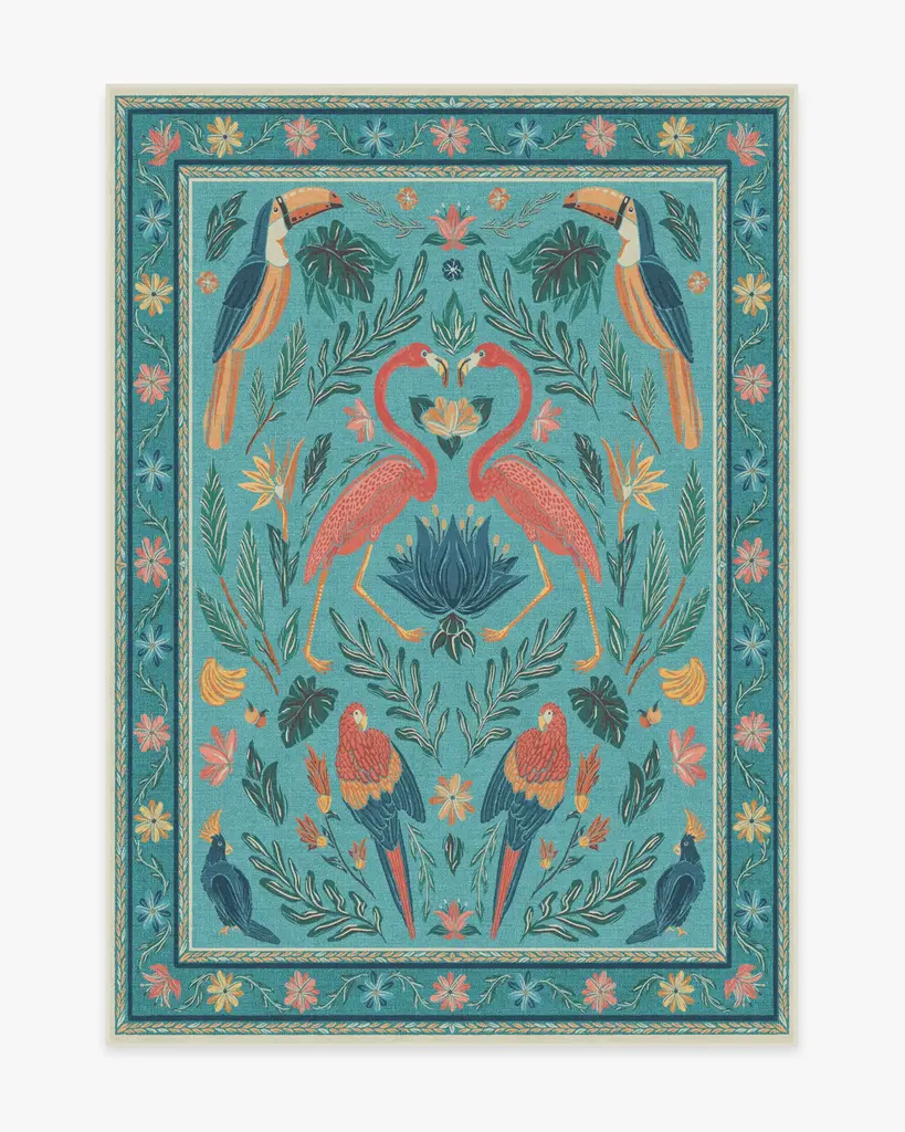 Im-peck-able. Our Birds of a Feather Aqua Rug is a bold and bright celebration of tropical birds - including toucans, parrots, and flamingos. This mirrored design boasts a jewel-toned color palette of aqua blue, pink, yellow, and teal green. Set against an aqua background reminiscent of Palm Beach, the bold contrast evokes lively, playful energy similar to that of the exotic birds depicted. Water-resistant, stain-resistant, and machine-washable. Rug colors may vary slightly according to your device and the lighting in your space.