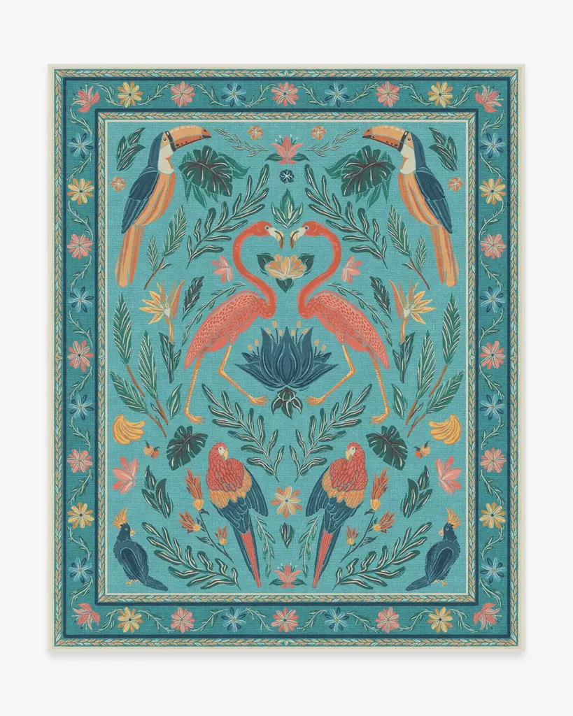 Im-peck-able. Our Birds of a Feather Green & Peach Rug is a bold and bright celebration of tropical birds - including toucans, parrots, and flamingos. This mirrored design boasts a green and peach palette of tangerine, pink, yellow, and leafy green. Set against a nude background with a green border reminiscent of Palm Beach, the bold contrast evokes lively, playful energy similar to that of the exotic birds depicted. Water-resistant, stain-resistant, and machine-washable. Rug colors may vary slightly according to your device and the lighting in your space.