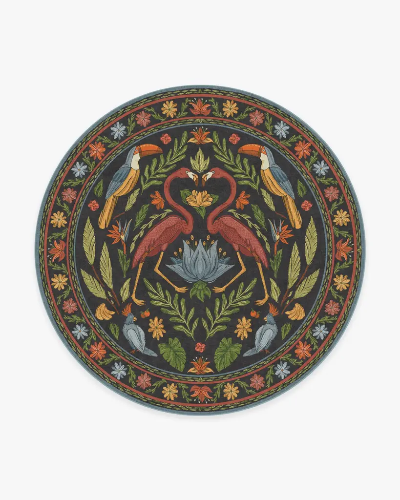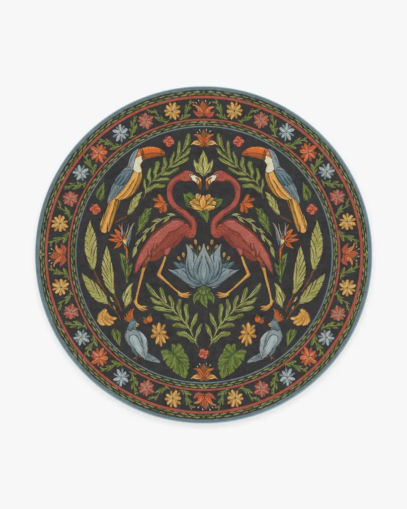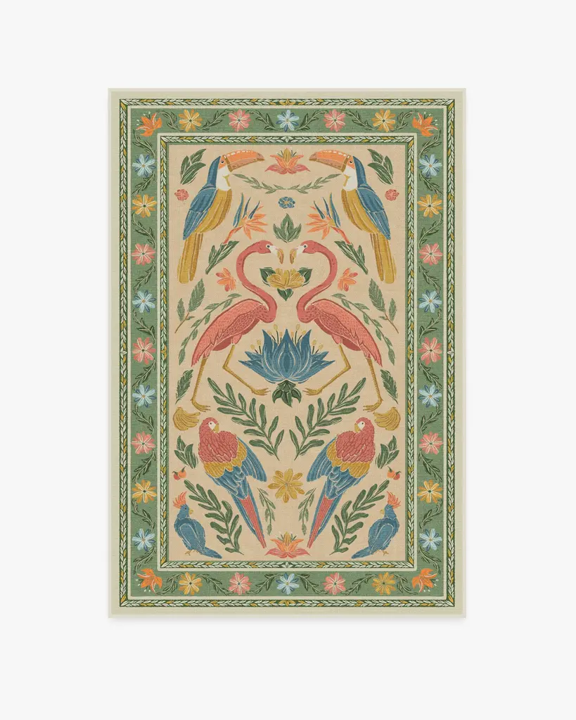 Im-peck-able. Our Birds of a Feather Green & Peach Rug is a bold and bright celebration of tropical birds - including toucans, parrots, and flamingos. This mirrored design boasts a green and peach palette of tangerine, pink, yellow, and leafy green. Set against a nude background with a green border reminiscent of Palm Beach, the bold contrast evokes lively, playful energy similar to that of the exotic birds depicted. Water-resistant, stain-resistant, and machine-washable. Rug colors may vary slightly according to your device and the lighting in your space.