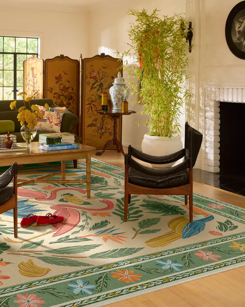 Im-peck-able. Our Birds of a Feather Green & Peach Rug is a bold and bright celebration of tropical birds - including toucans, parrots, and flamingos. This mirrored design boasts a green and peach palette of tangerine, pink, yellow, and leafy green. Set against a nude background with a green border reminiscent of Palm Beach, the bold contrast evokes lively, playful energy similar to that of the exotic birds depicted. Water-resistant, stain-resistant, and machine-washable. Rug colors may vary slightly according to your device and the lighting in your space.
