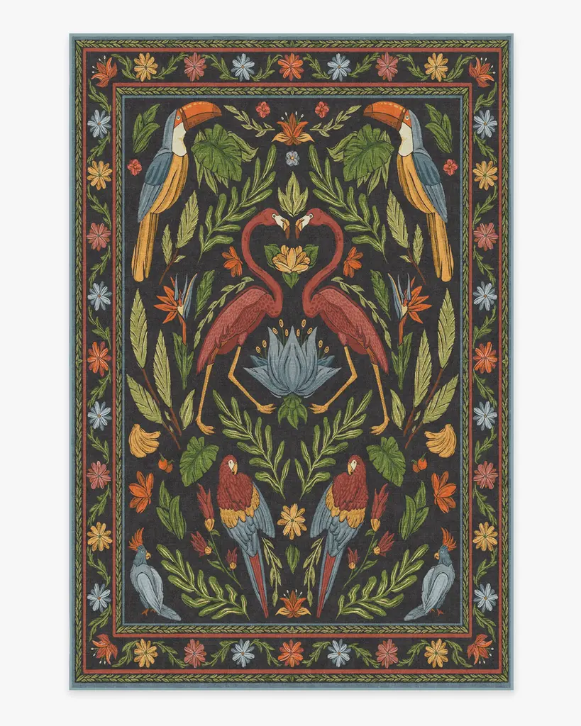 Im-peck-able. Our Birds of a Feather Rug is a bold and bright celebration of tropical birds - including toucans, parrots, and flamingos. This mirrored design boasts a warm-toned color palette of pink, orange, yellow, and blue. Set against a charcoal background, the bold contrast evokes lively, playful energy, similar to that of the exotic birds depicted. Water-resistant, stain-resistant, and machine-washable.