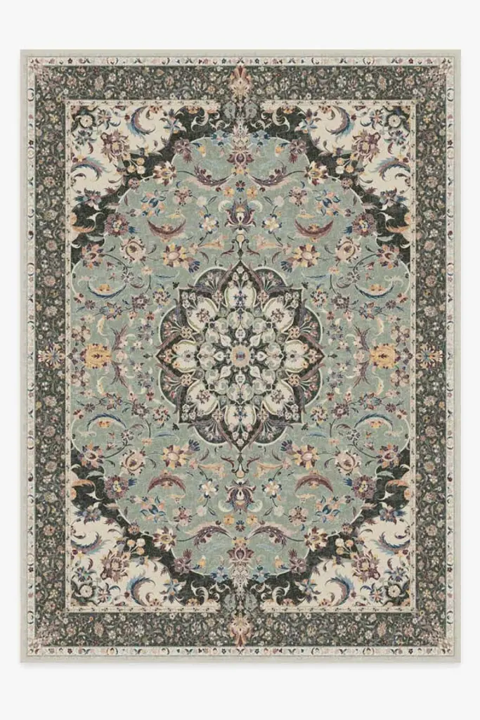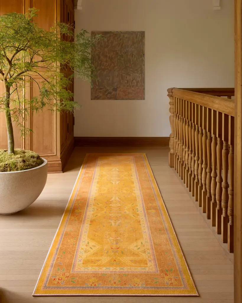 Unleash your creativity with our Iris Apfel Colorful Loom Mango Rug. Inspired by traditional Turkish loom rugs, this bright design reflects Iris' eclectic and luxurious approach to style. It features beautiful motifs drawn from her fashion along with geometric figures inspired by her personal jewelry collection. Its vibrant palette mixes pastel drops of orange, purple, lavender, green, teal, blue, and cream — all against a yellow background. Water-resistant, stain-resistant, and machine-washable. Rug colors may vary slightly according to your device and the lighting in your space.
