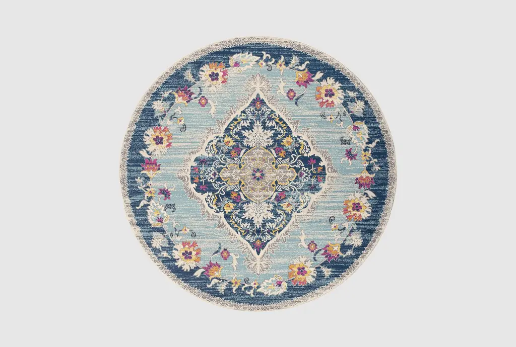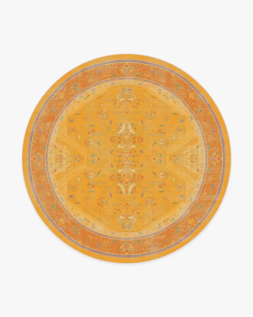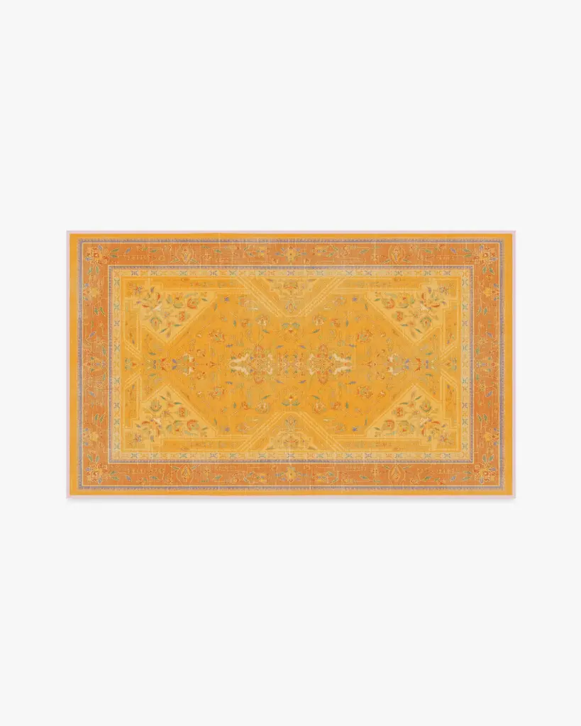 Unleash your creativity with our Iris Apfel Colorful Loom Mango Rug. Inspired by traditional Turkish loom rugs, this bright design reflects Iris' eclectic and luxurious approach to style. It features beautiful motifs drawn from her fashion along with geometric figures inspired by her personal jewelry collection. Its vibrant palette mixes pastel drops of orange, purple, lavender, green, teal, blue, and cream — all against a yellow background. Water-resistant, stain-resistant, and machine-washable. Rug colors may vary slightly according to your device and the lighting in your space.