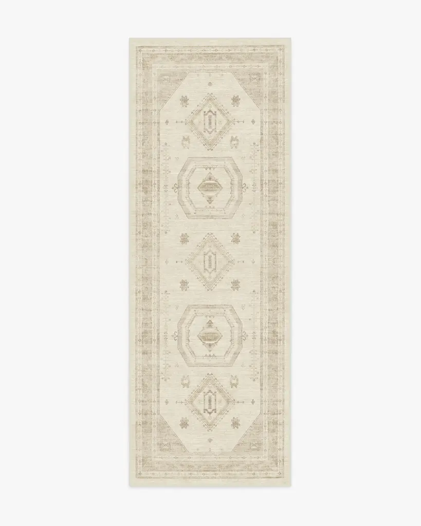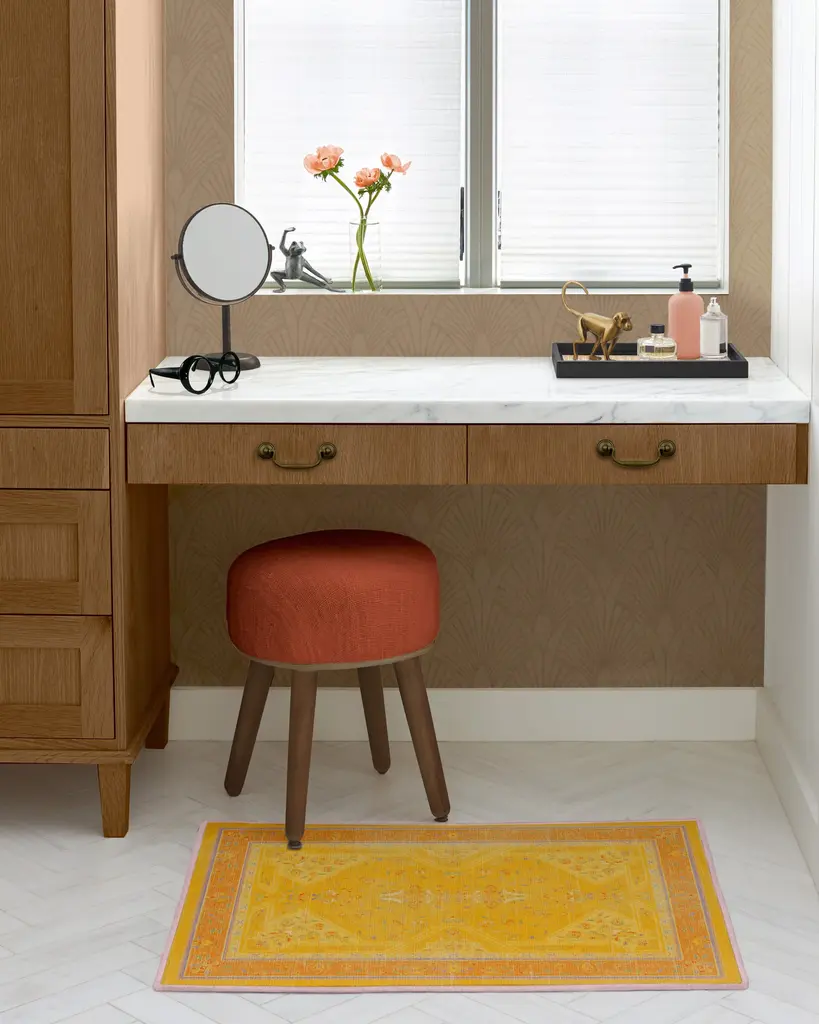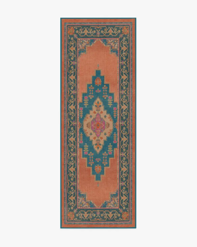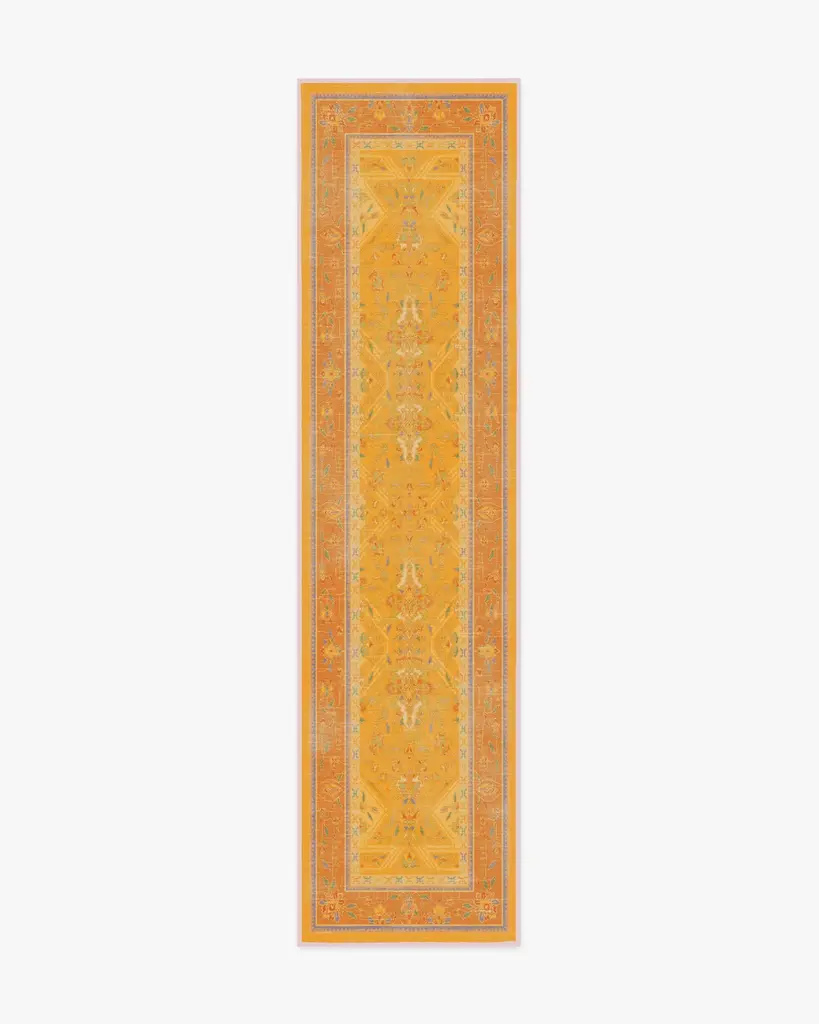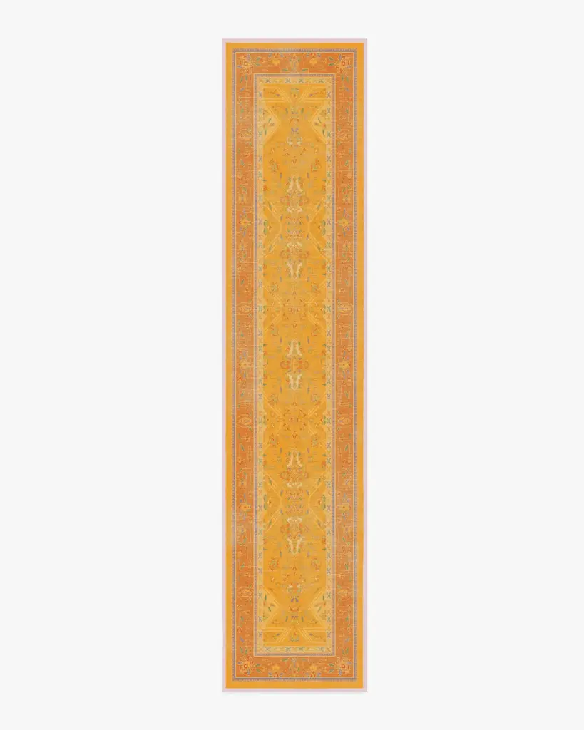 Unleash your creativity with our Iris Apfel Colorful Loom Mango Rug. Inspired by traditional Turkish loom rugs, this bright design reflects Iris' eclectic and luxurious approach to style. It features beautiful motifs drawn from her fashion along with geometric figures inspired by her personal jewelry collection. Its vibrant palette mixes pastel drops of orange, purple, lavender, green, teal, blue, and cream — all against a yellow background. Water-resistant, stain-resistant, and machine-washable. Rug colors may vary slightly according to your device and the lighting in your space.