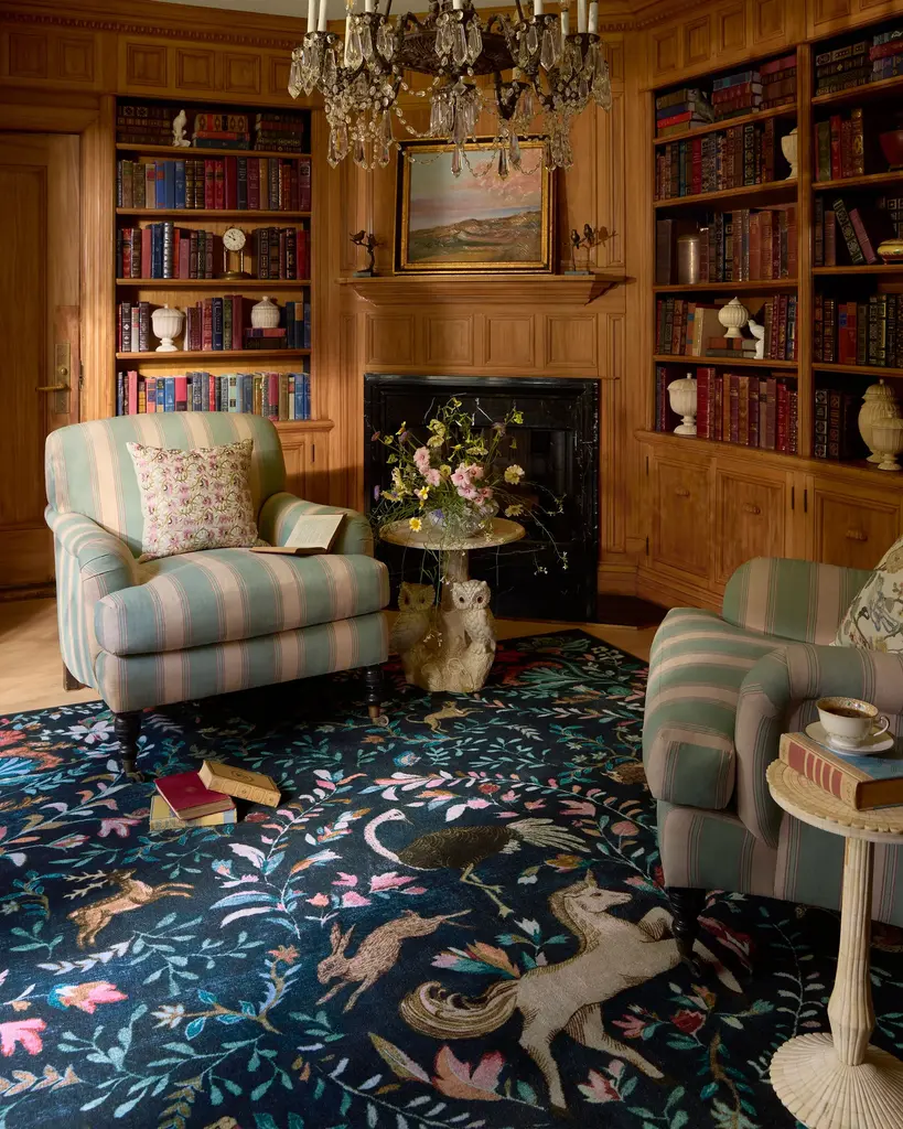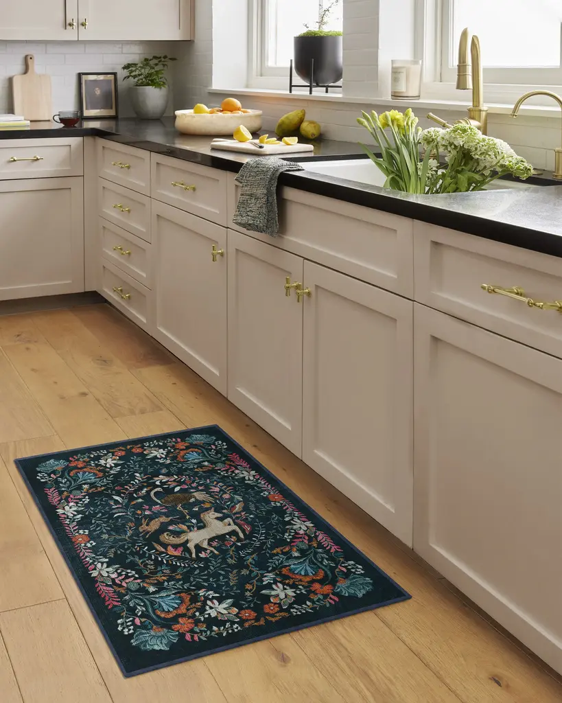 Unleash your inner unicorn with our Iris Apfel Dreamweaver Blue Multicolor Rug. Inspired by Iris' tendency to combine sophistication and fantasy, this dreamy tapestry design features whimsical flora and fauna in a plethora of azure hues. The rest of its dreamlike palette is complemented by blush pink, gold, verdigris green, cerulean blue, cream, and brown — all against a midnight blue background. Water-resistant, stain-resistant, and machine-washable. Rug colors may vary slightly according to your device and the lighting in your space.