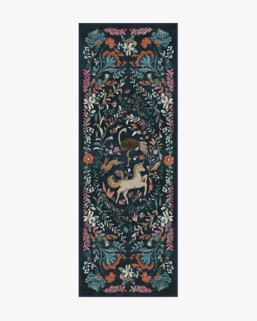 Unleash your inner unicorn with our Iris Apfel Dreamweaver Blue Multicolor Rug. Inspired by Iris' tendency to combine sophistication and fantasy, this dreamy tapestry design features whimsical flora and fauna in a plethora of azure hues. The rest of its dreamlike palette is complemented by blush pink, gold, verdigris green, cerulean blue, cream, and brown — all against a midnight blue background. Water-resistant, stain-resistant, and machine-washable. Rug colors may vary slightly according to your device and the lighting in your space.
