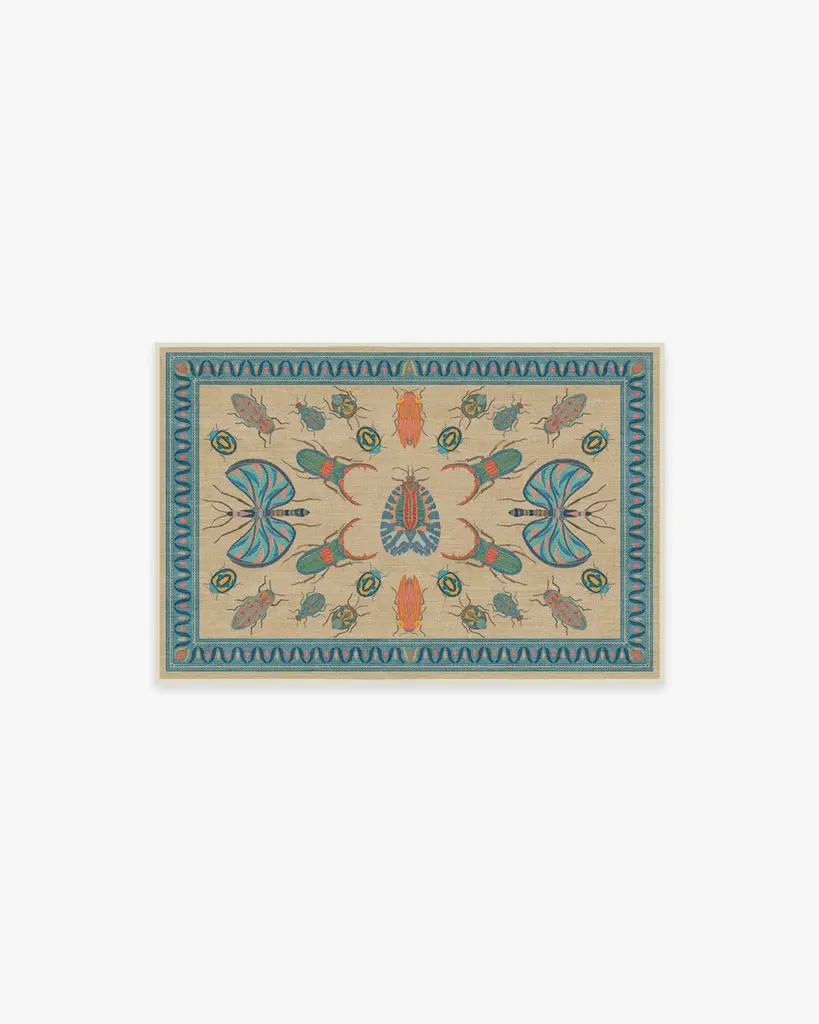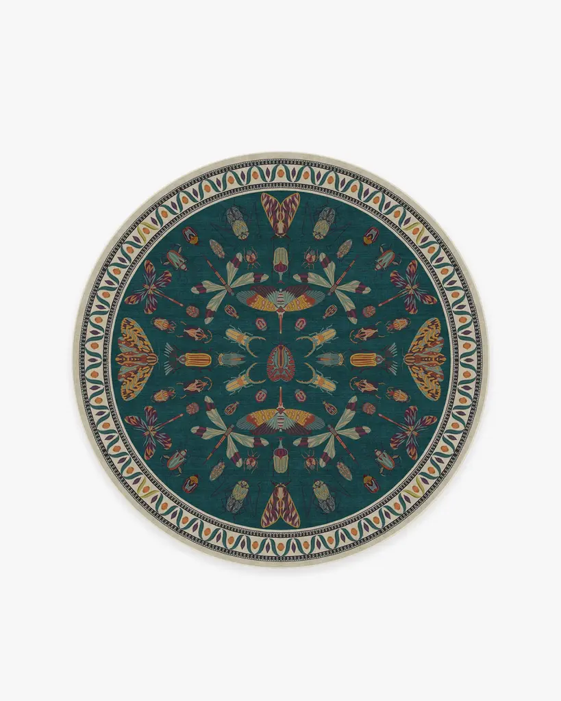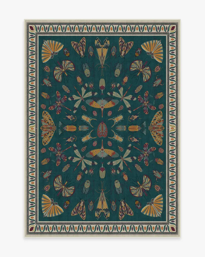 "It's a bug's life. Our Iris Apfel Flutterby Multicolor Rug showcases a diverse mix of extravagant insects in candy pink, coral, and shades of blue. Brightly colored in a spring palette, this intricate design is inspired by the fashion icon's unique and bold sense of style. Look for fluttering butterflies near the zigzag aqua border, all complemented by a gentle nude background. Water-resistant, stain-resistant, and machine-washable. Rug colors may vary slightly according to your device and the lighting in your space. "