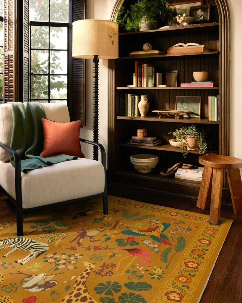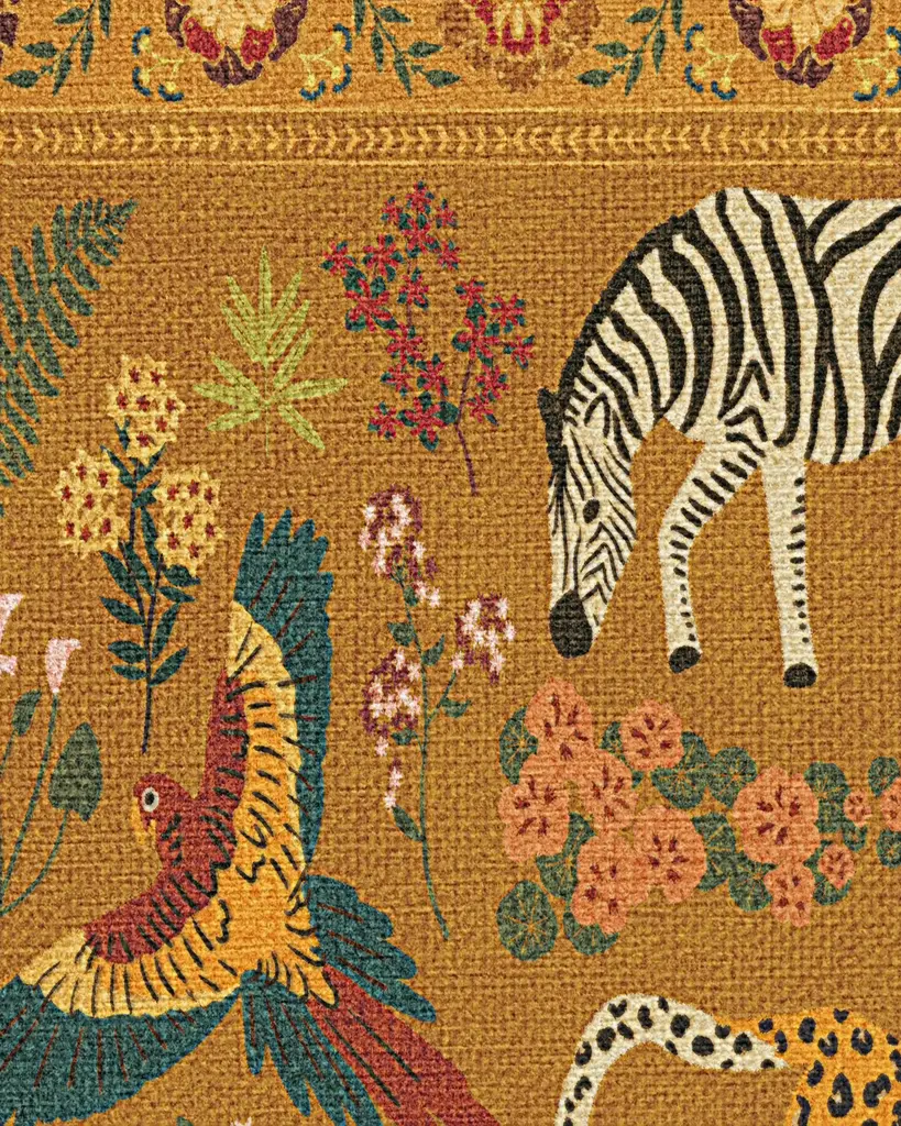 Dare to be iconic with our Iris Apfel Jingle Jungle Ochre Rug. Inspired by Iris' adventurous spirit, this wildlife-filled design features exotic animals roaming among lush foliage. A vivid color palette with splashes of yellow, orange, coral, pink, and yellow-green, teal, and warm beige pops against an ochre background. Water-resistant, stain-resistant, and machine-washable. Rug colors may vary slightly according to your device and the lighting in your space.