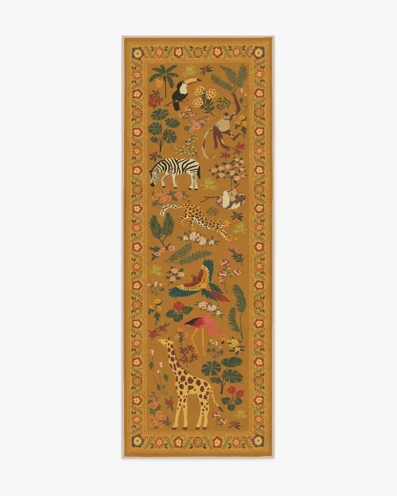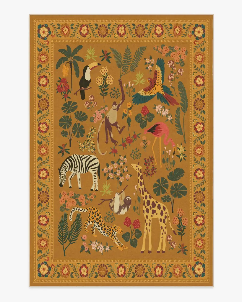 Dare to be iconic with our Iris Apfel Jingle Jungle Ochre Rug. Inspired by Iris' adventurous spirit, this wildlife-filled design features exotic animals roaming among lush foliage. A vivid color palette with splashes of yellow, orange, coral, pink, and yellow-green, teal, and warm beige pops against an ochre background. Water-resistant, stain-resistant, and machine-washable. Rug colors may vary slightly according to your device and the lighting in your space.