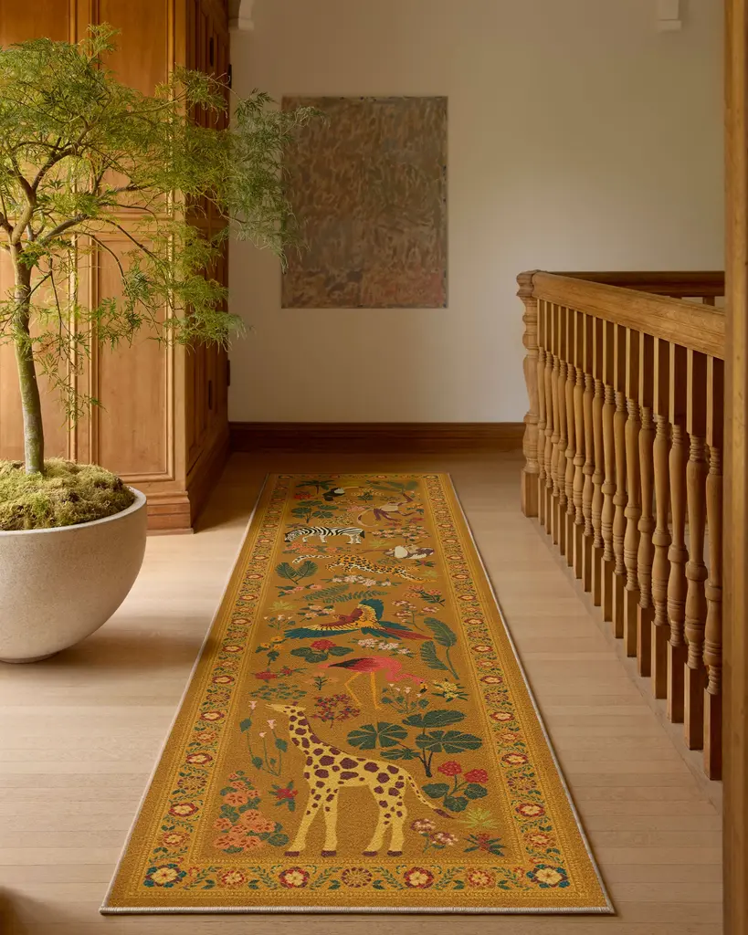 Dare to be iconic with our Iris Apfel Jingle Jungle Ochre Rug. Inspired by Iris' adventurous spirit, this wildlife-filled design features exotic animals roaming among lush foliage. A vivid color palette with splashes of yellow, orange, coral, pink, and yellow-green, teal, and warm beige pops against an ochre background. Water-resistant, stain-resistant, and machine-washable. Rug colors may vary slightly according to your device and the lighting in your space.