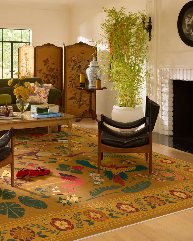 Dare to be iconic with our Iris Apfel Jingle Jungle Ochre Rug. Inspired by Iris' adventurous spirit, this wildlife-filled design features exotic animals roaming among lush foliage. A vivid color palette with splashes of yellow, orange, coral, pink, and yellow-green, teal, and warm beige pops against an ochre background. Water-resistant, stain-resistant, and machine-washable. Rug colors may vary slightly according to your device and the lighting in your space.